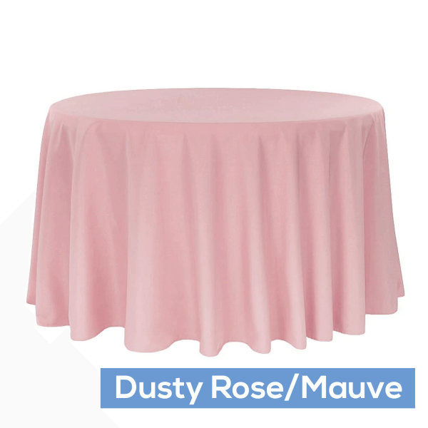 Color: Dusty Rose/Mauve Material: 100% Polyester Fabric Weight: Approx. 200 GSM Size: Approx. 120" round diameter (seamless) Pack: 1 per polybag Care Instruction: Machine Washable & Dryable. Do not bleach. Drop: A 120" Tablecloth over a 60" Round Table (standard 30" table height) will touch the floor. A 120" Tablecloth over a 72" Round Table (standard 30" table height) will hang 6" above the floor.