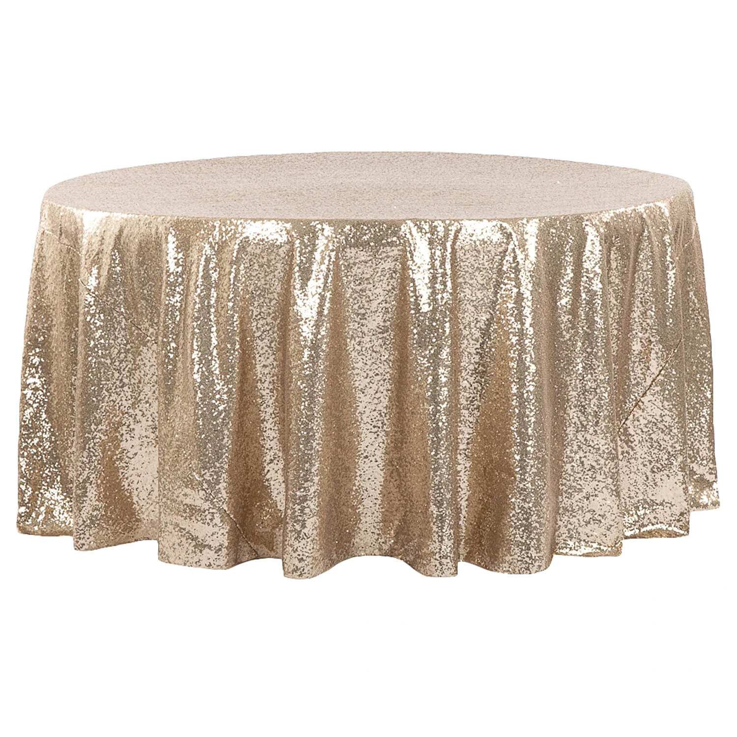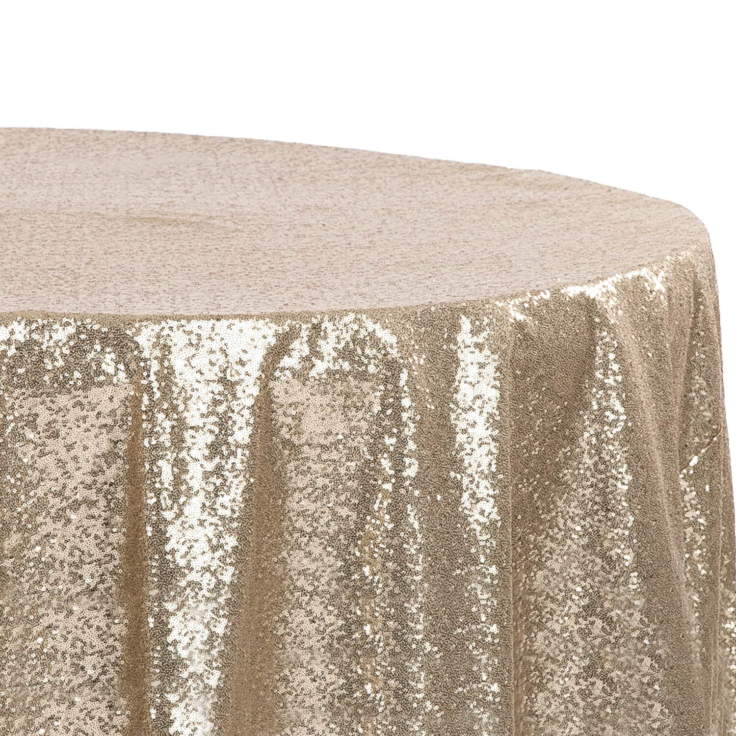 These shimmering, champagne colored tablecloths bring instant sparkle to your event. Made for round banquet tables, these tablecloths are a party favorite. A blend between traditional and glam.