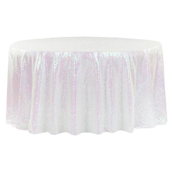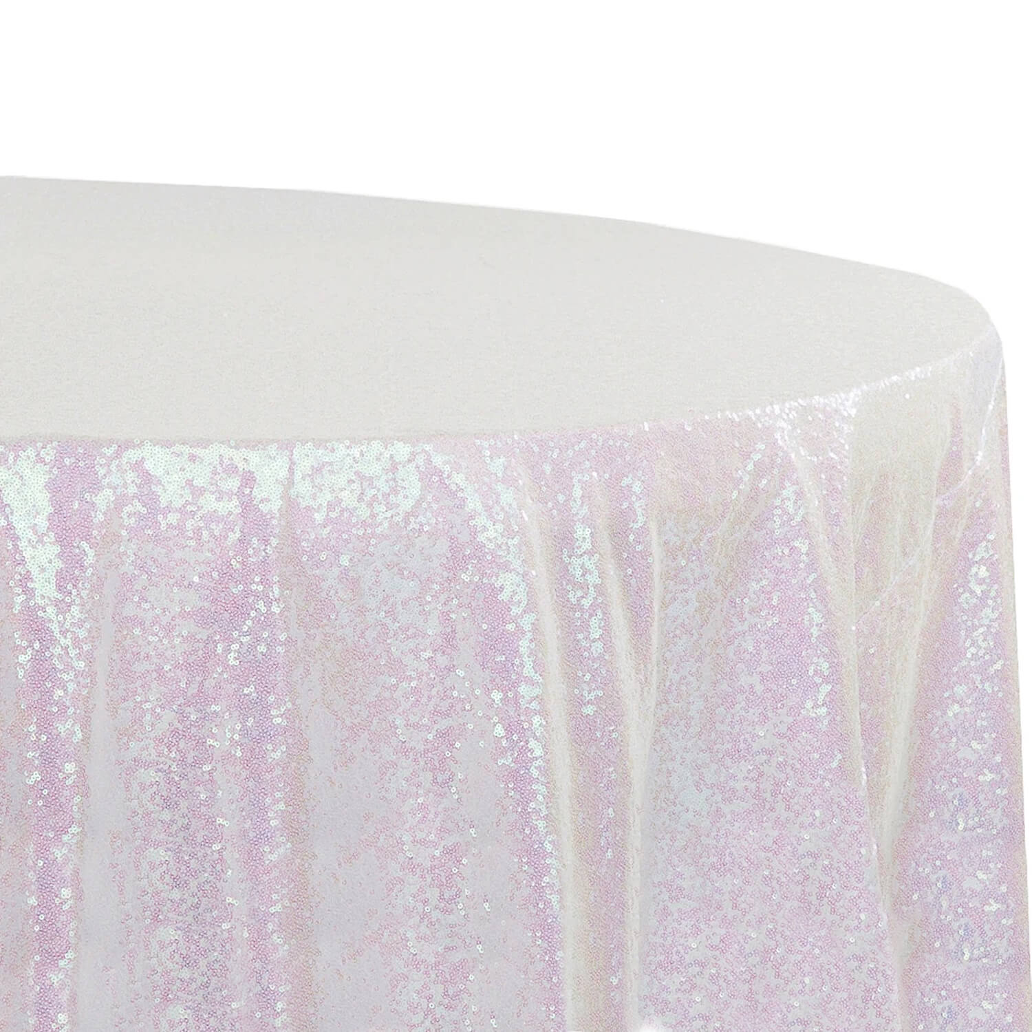 These shimmering iridescent white sequined tablecloths bring instant sparkle to your event. Made for round banquet tables, these tablecloths are a party favorite. A blend between traditional and glam.
