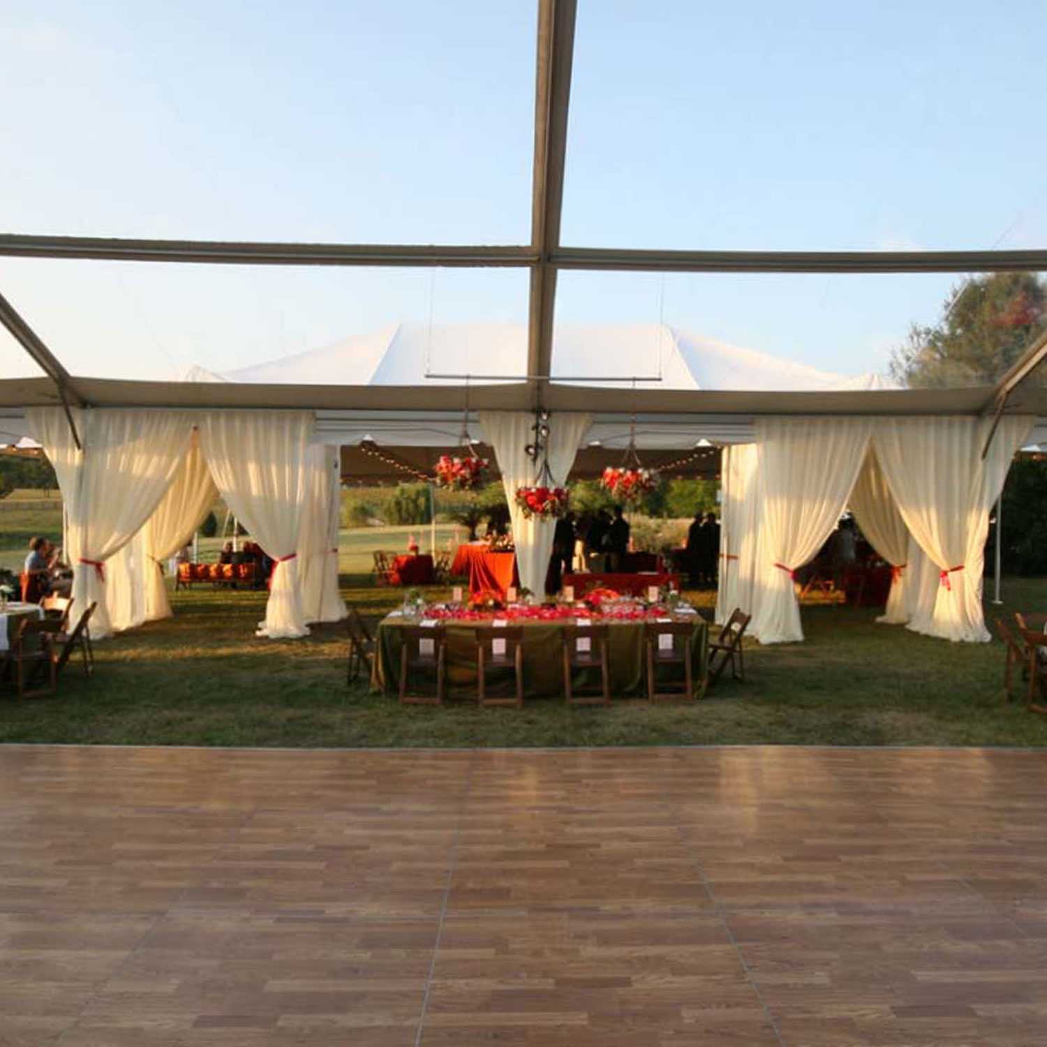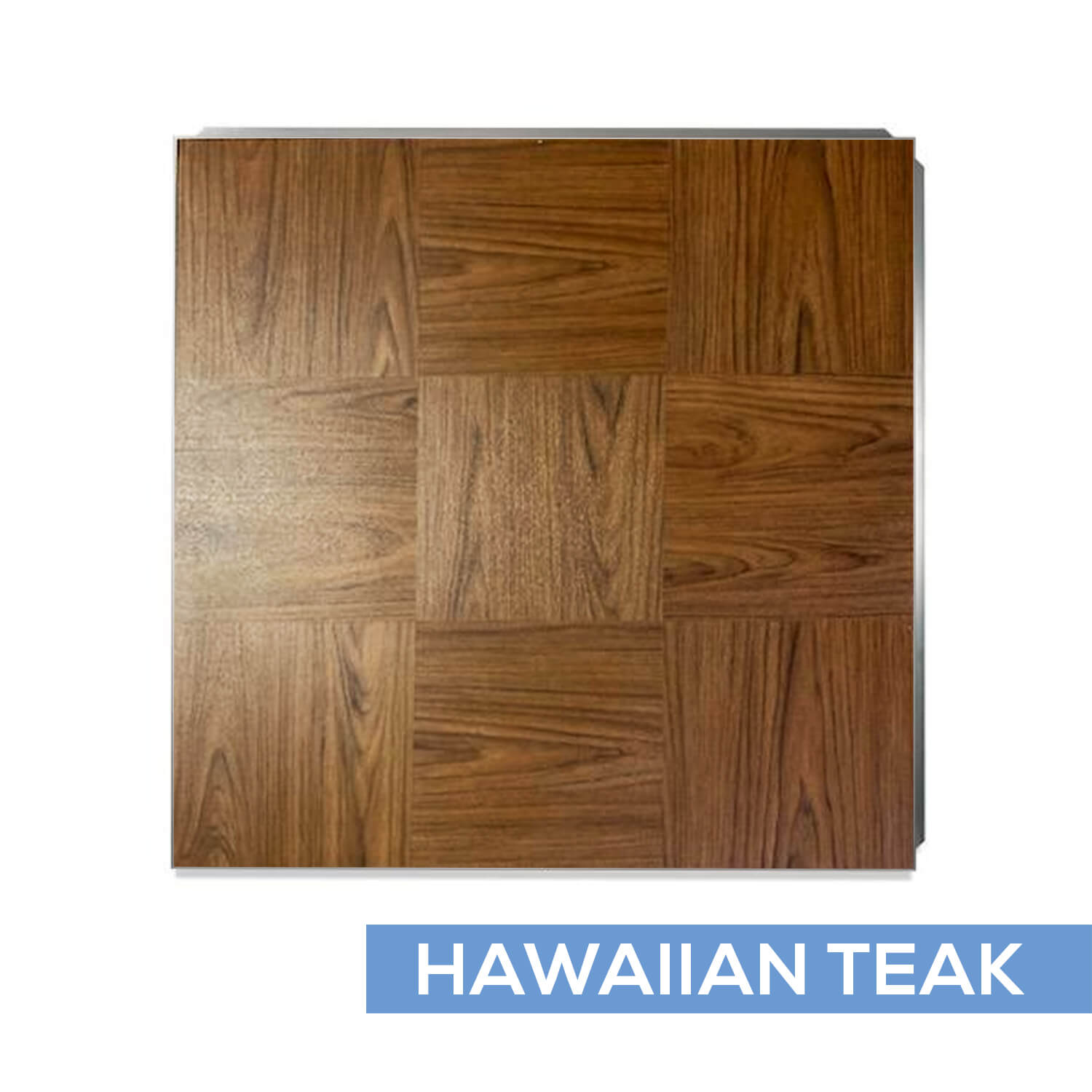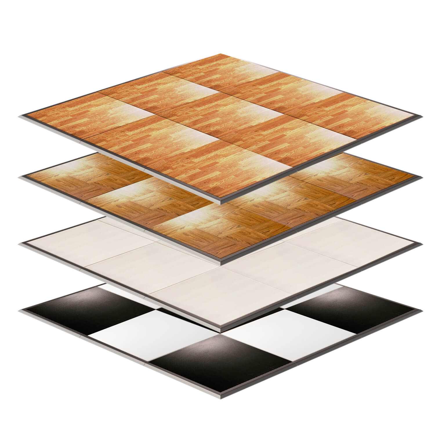 Our composite laminate, high quality, large panel, dance floors are water, scratch, and weather-resistant. An exterior grade, moisture resistant, 3/4″ plywood base, a pressure treated composite laminate top, and a resin coated backing, make these laminate dance floor one of the most durable floors available.