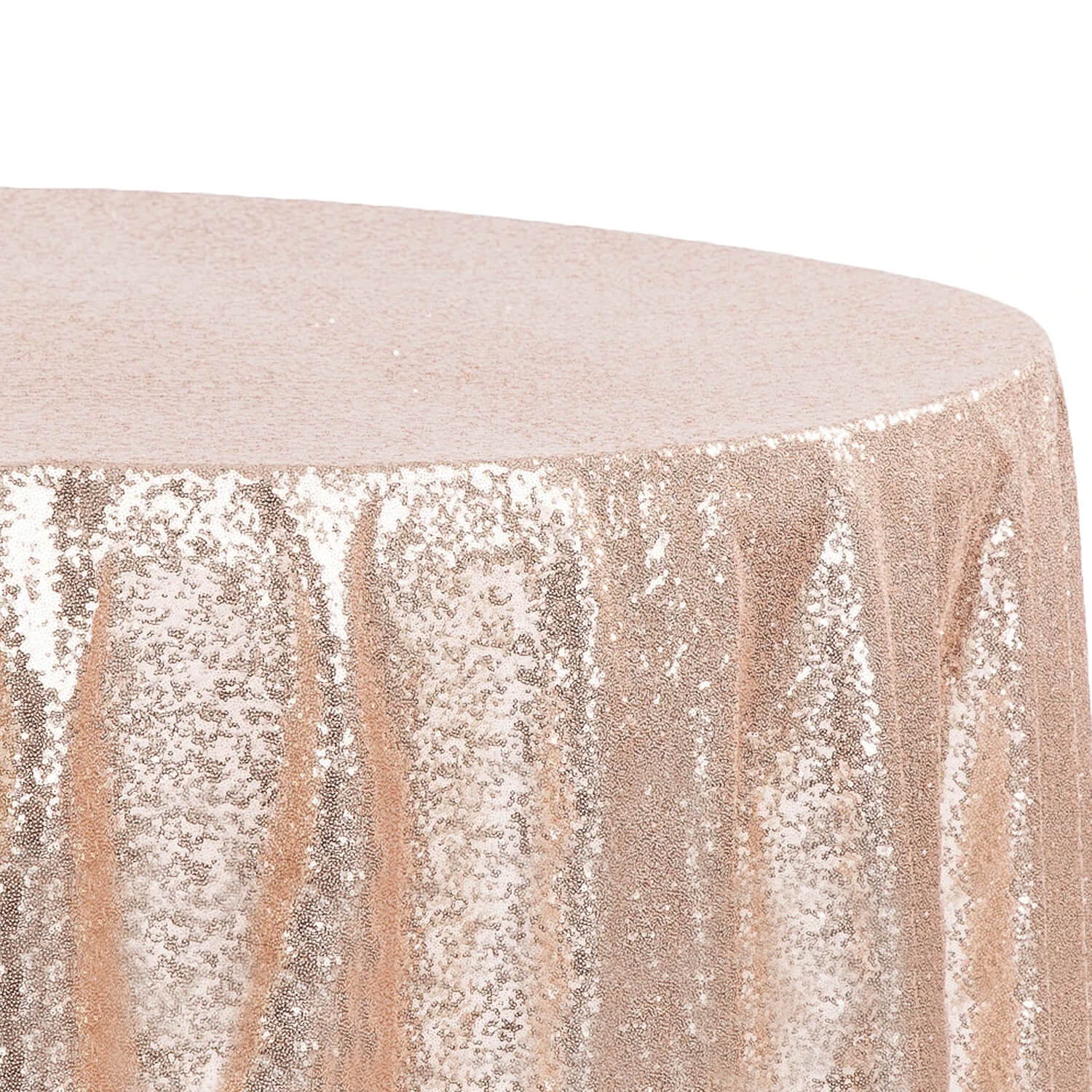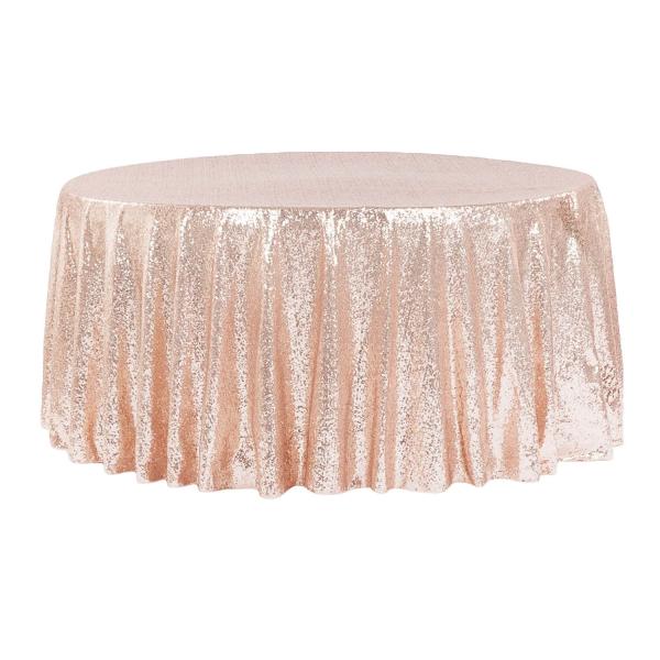 These blush toned, peach/gold sequined tablecloths bring instant sparkle to your event. Made for round banquet tables, these tablecloths are a party favorite. A perfect blend of traditional and glam.