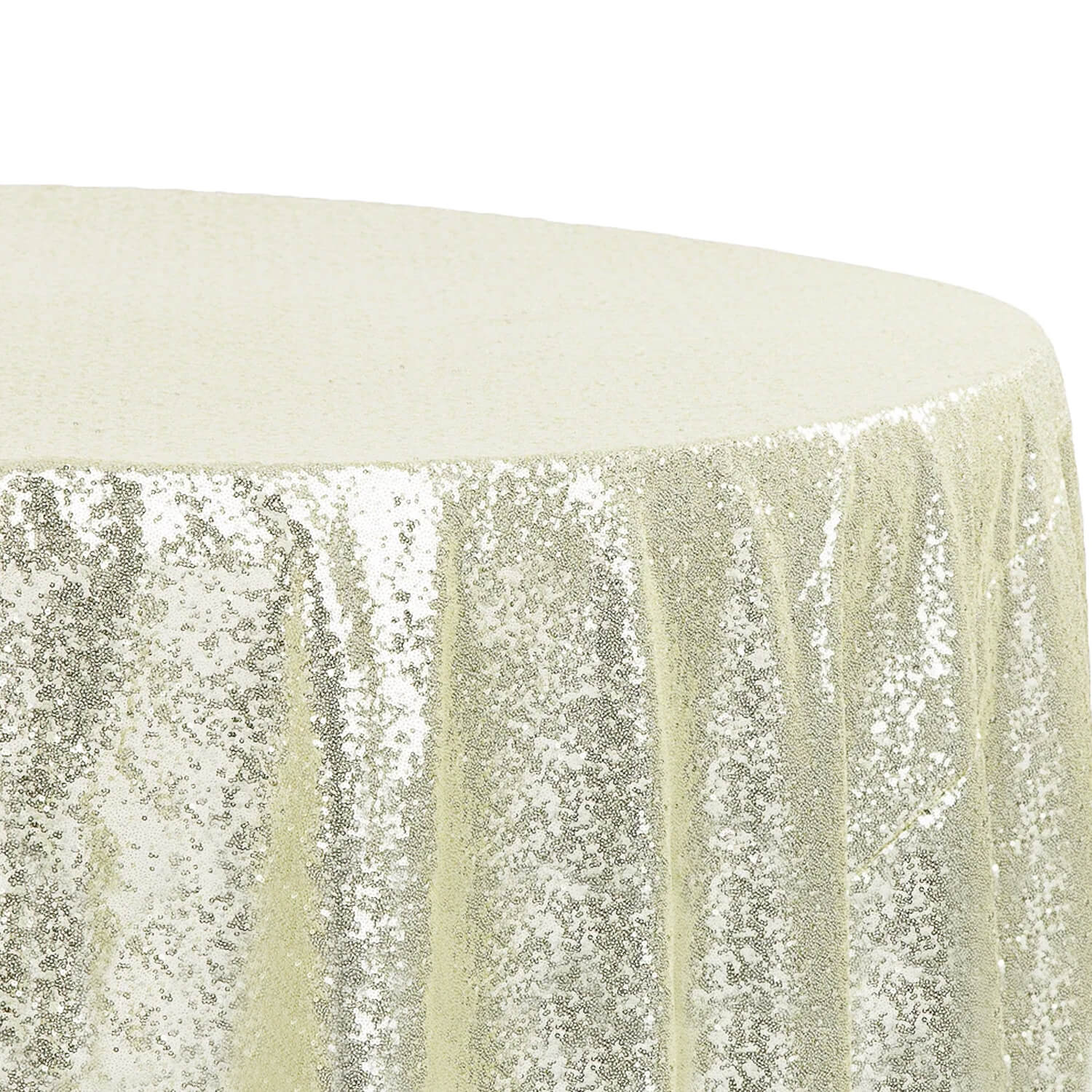 These ivory white sequined table cloths bring instant sparkle to your event. Made for round banquet tables, the tone offers a classic look with a bit of glam.