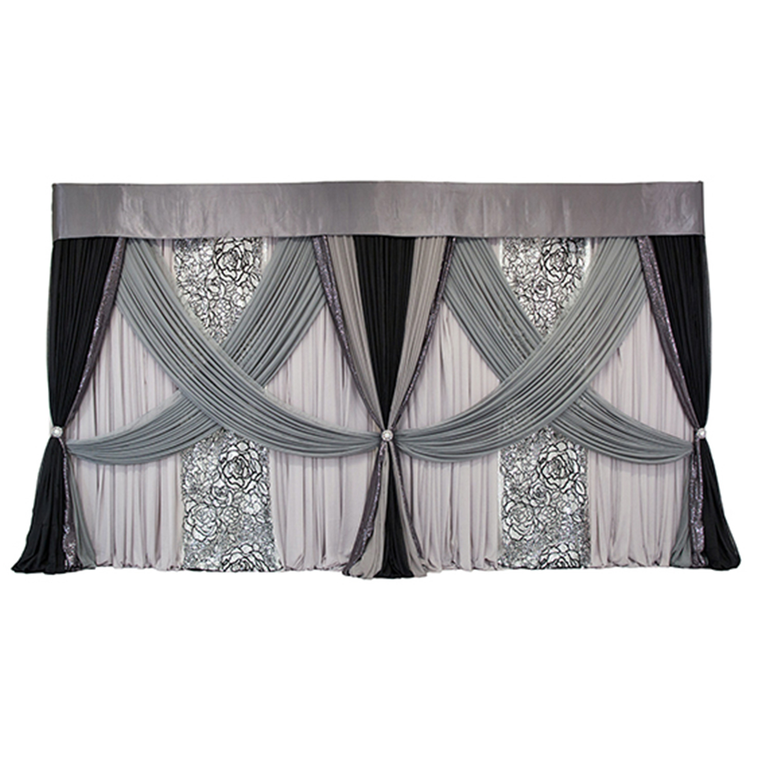 This backdrop features shades of silver and pops of black making it a truly luxuriant modern monochromatic dream. Each layer adds depth and intrigue in thi wedding table backdrop design with satin, felt cutouts, and sequin accents. Use it to showcase a centerpiece that needs accentuating or as a backdrop for dramatic photographs.