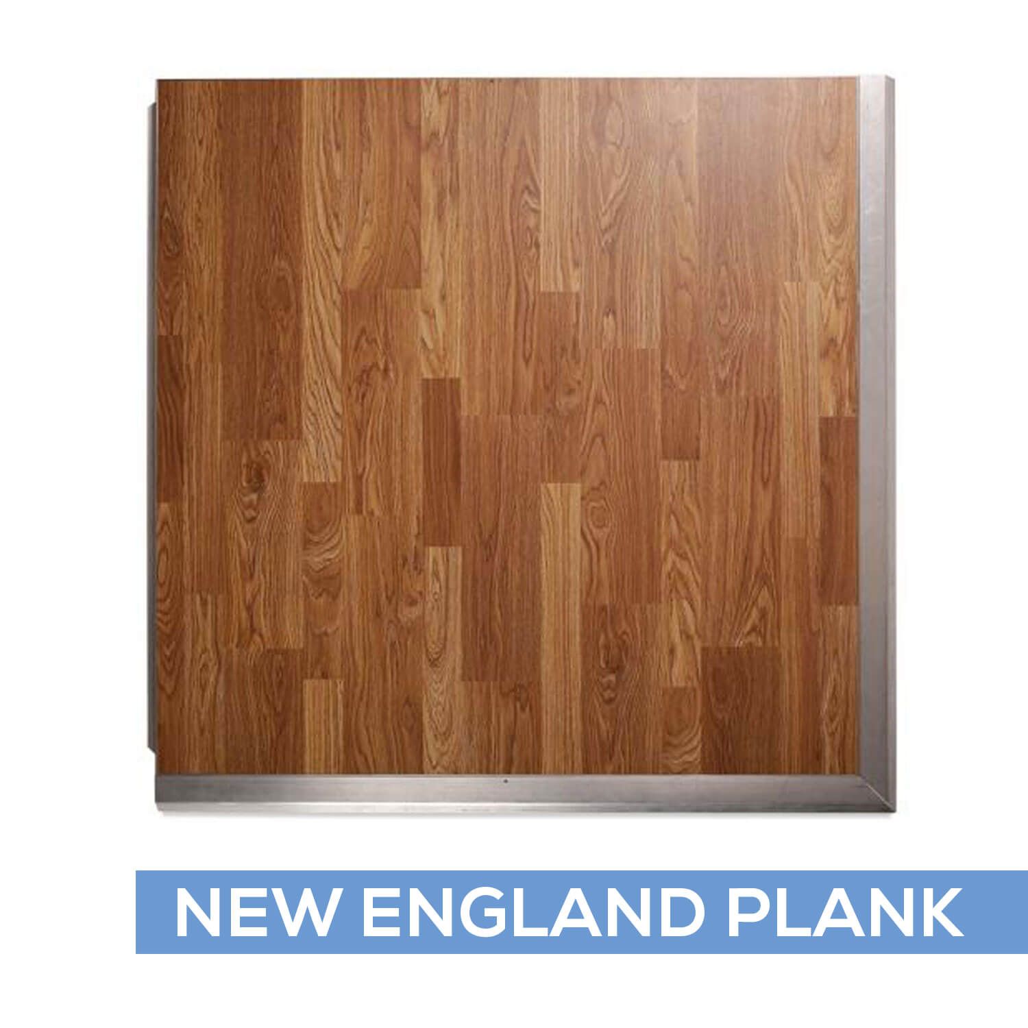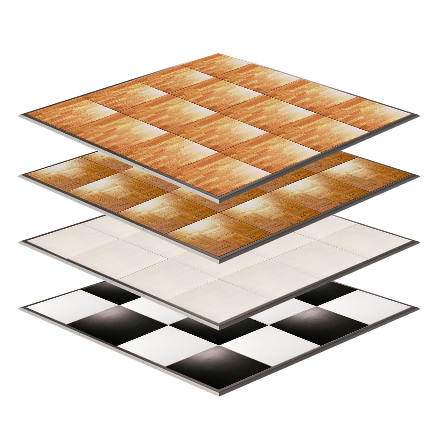 Our composite laminate, high quality, large panel, dance floors are water, scratch, and weather-resistant. An exterior grade, moisture resistant, 3/4″ plywood base, a pressure treated composite laminate top, and a resin coated backing, make these laminate dance floor one of the most durable floors available.