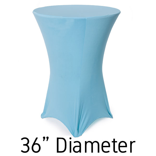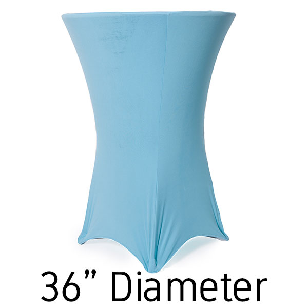 This 36” aqua blue spandex hi-boy table cover creates a table that blends and stands out in your decor. Our 36” aqua blue table covers stretch over the top to the bottom up to 36” wide and 30-42” tall cocktail tables. Because of the stretch of our aqua blue spandex, you can fit square, triangular, and round cocktail tables.