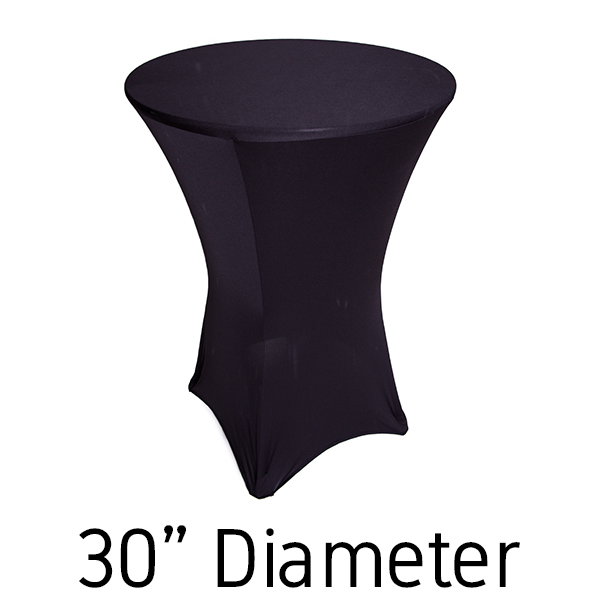 This 30” black spandex hi-boy table cover is a necessity for any elegant event with cocktail tables. Our 30” black table covers stretch over the top to the bottom up to 36” wide and 30-42” tall cocktail tables. Because of the stretch of our black spandex, you can fit square, triangular, and round cocktail tables.