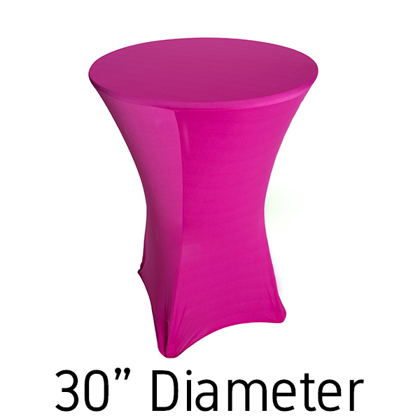 This 30” fuchsia spandex hi-boy table cover allows you to blend cocktail tables into your decor with ease. Our 30” fuchsia table covers stretch over the top to the bottom up to 36” wide and 30-42” tall cocktail tables. Because of the stretch of our fuchsia spandex, you can fit square, triangular, and round cocktail tables.