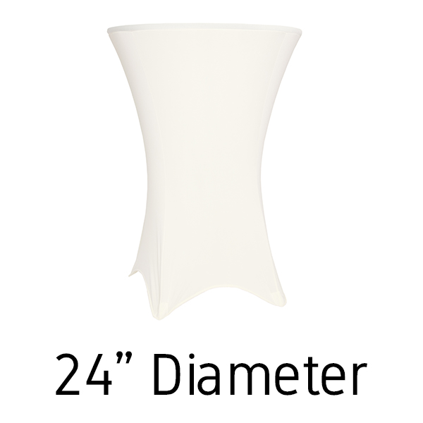 This 24” ivory spandex hi-boy table cover gives your decor a beautiful cover and fresh look. Our 24” ivory table covers stretch over the top to the bottom up to 36” wide and 30-42” tall cocktail tables. Because of the stretch of our ivory spandex, you can fit square, triangular, and round cocktail tables.