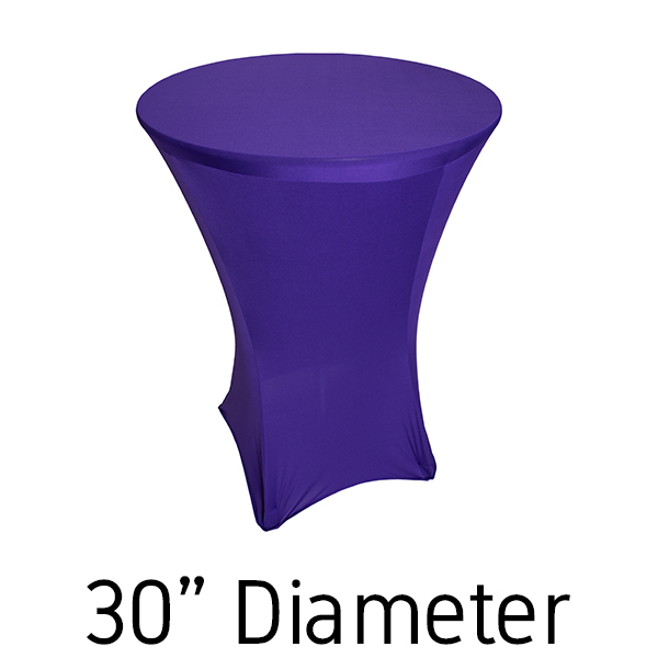 This 30” purple spandex hi-boy table cover allows you to turn your tables into colorful decorations. Our 30” purple table covers stretch over the top to the bottom up to 36” wide and 30-42” tall cocktail tables. Because of the stretch of our purple spandex, you can fit square, triangular, and round cocktail tables.