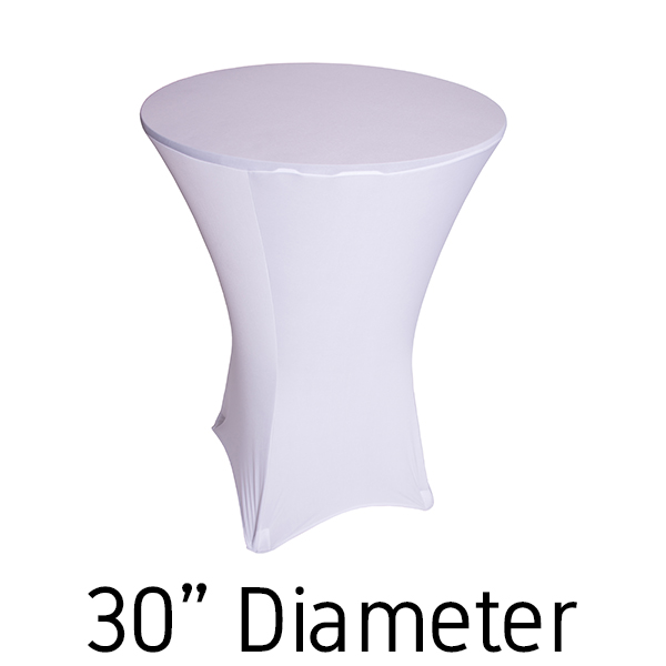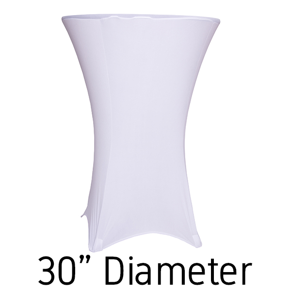 This 30” white spandex hi-boy table cover will make your decor the envy of every decorator. Our 30” white table covers stretch over the top to the bottom up to 36” wide and 30-42” tall cocktail tables. Because of the stretch of our white spandex, you can fit square, triangular, and round cocktail tables.