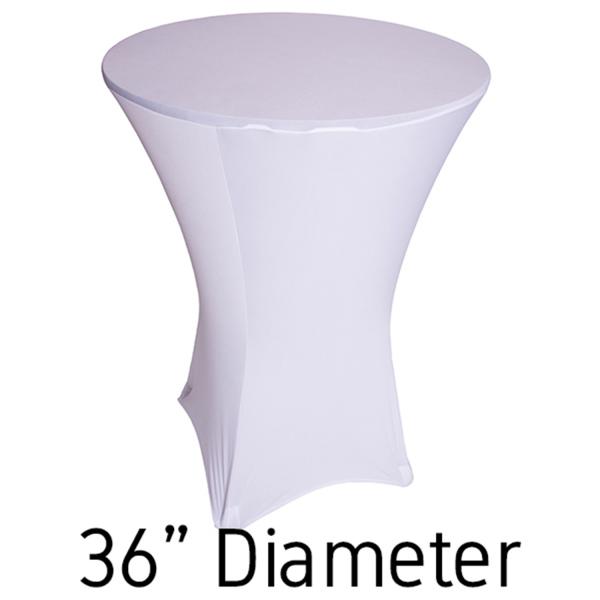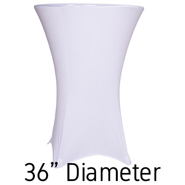 This 36” white spandex hi-boy table cover creates an elegant look to your table decor. Our 36” white table covers stretch over the top to the the bottom up to 36” wide and 30-42” tall cocktail tables. Because of the stretch of our white spandex, you can fit square, triangular, and round cocktail tables.