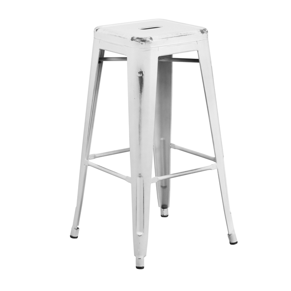 This 30” snow distressed stacking metal barstool allows your guests to sit in style as well as comfort. This snow distressed stool features an extra crossbar to keep your guests safe while also being lightweight and able to stack up to 10 snow stools high. Our protective plastic floor glides keep your floors free from marring.