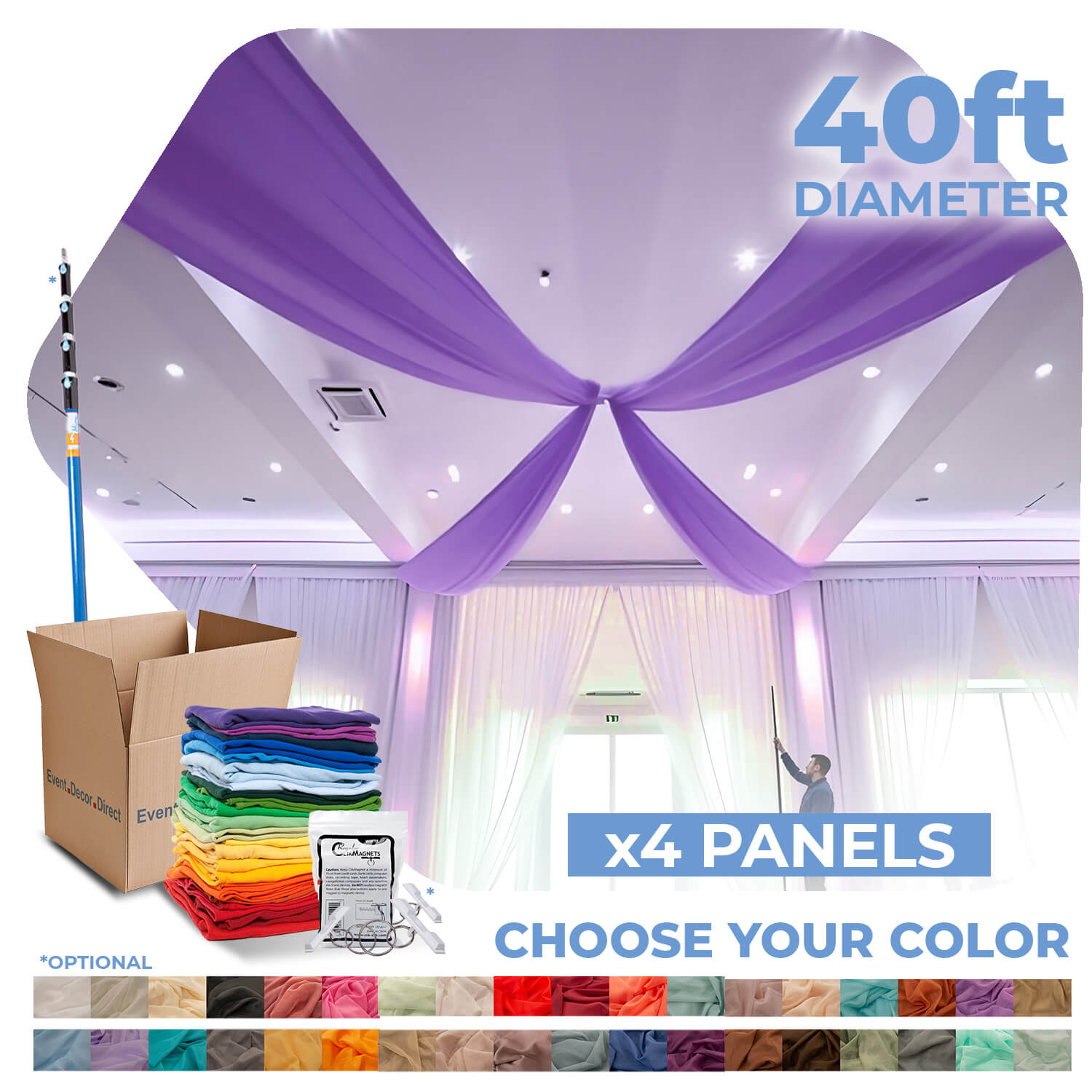 Our prefabricated kits allow you to set up full ceiling draping in just a few minutes, all from the ground - no ladder needed! With pre-sewn grommets and use of our magnet kit, ceiling draping has never been so elegant and easy to set up! Our kits come with many common hanging tools and a variety of options to fit your ceiling scenario.