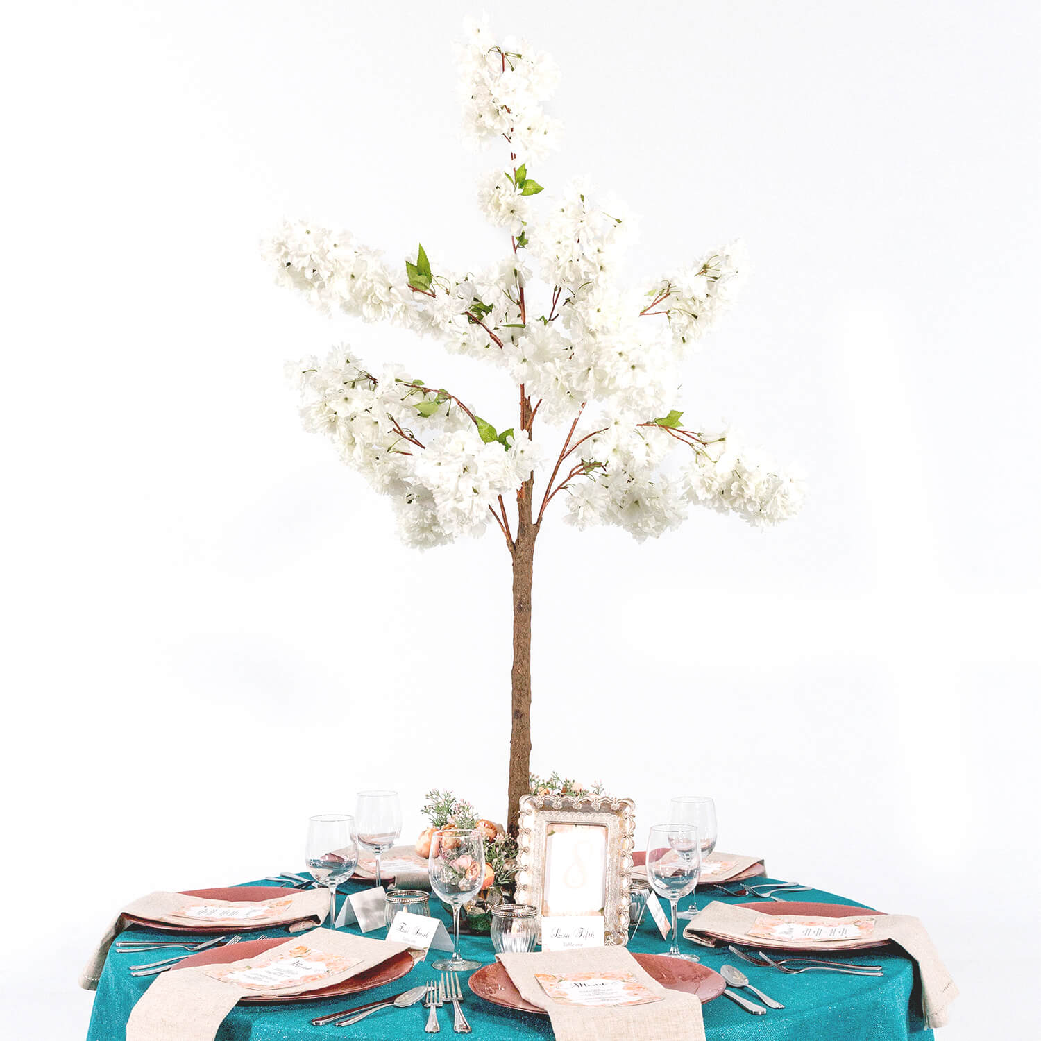 Create a truly magical experience with these 56” white hydrangea trees. Filled with tiny white blossoms, and topped with green leaves peaking from between the flowers, these tabletop trees will transform your event space into a blossoming springtime fairytale. Wonderful as centerpieces, or when incorporated into other floral displays, these delightful trees create a big impact making them ideal for intimate designs, corporate events, weddings, and outdoor parties.