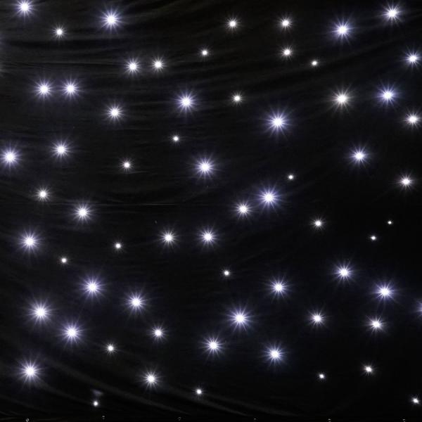These curtains are lightweight and flame-retardant. Made of velour, bright white LEDs peak out to create a starry effect.. Black grommets every 16" on all four side allow hanging in various configurations.