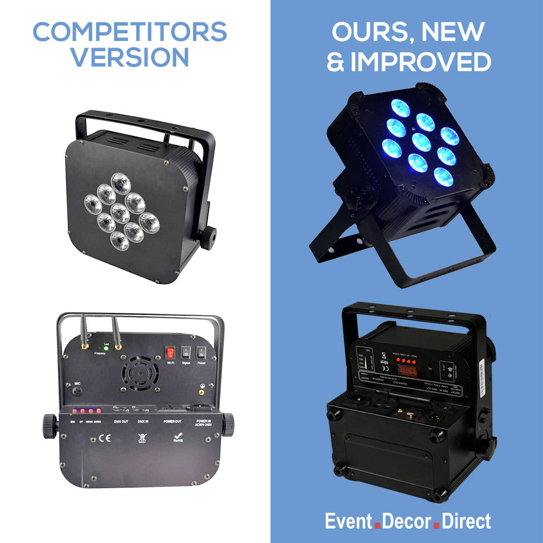 This 5 in 1 battery powered wireless DMX flat LED 6 pack of lights allows you to create wire-free lighting. These lights use a DMX channel so you can easily program these lights. They can also create any color in the rainbow. Our best feature is the free recharging flight case that you get with this kit.