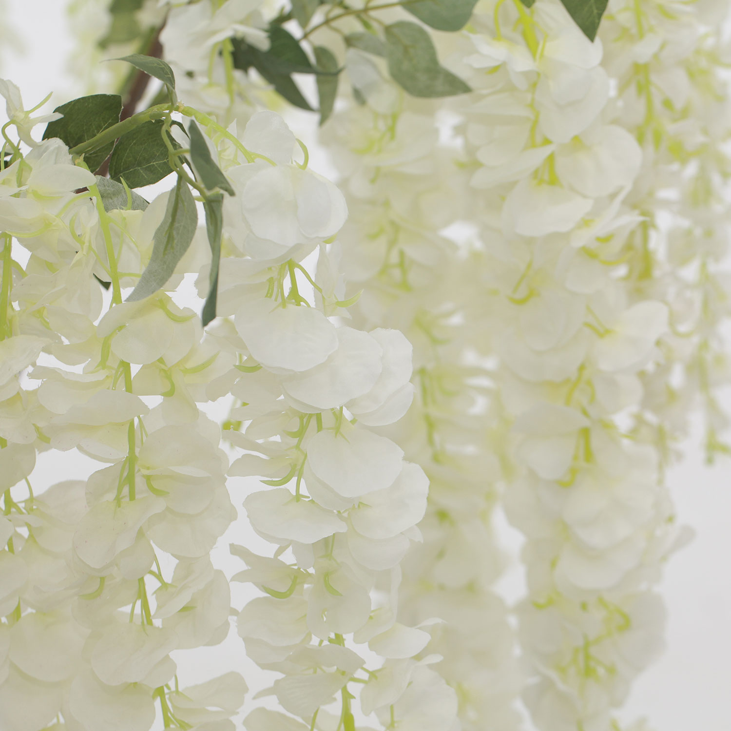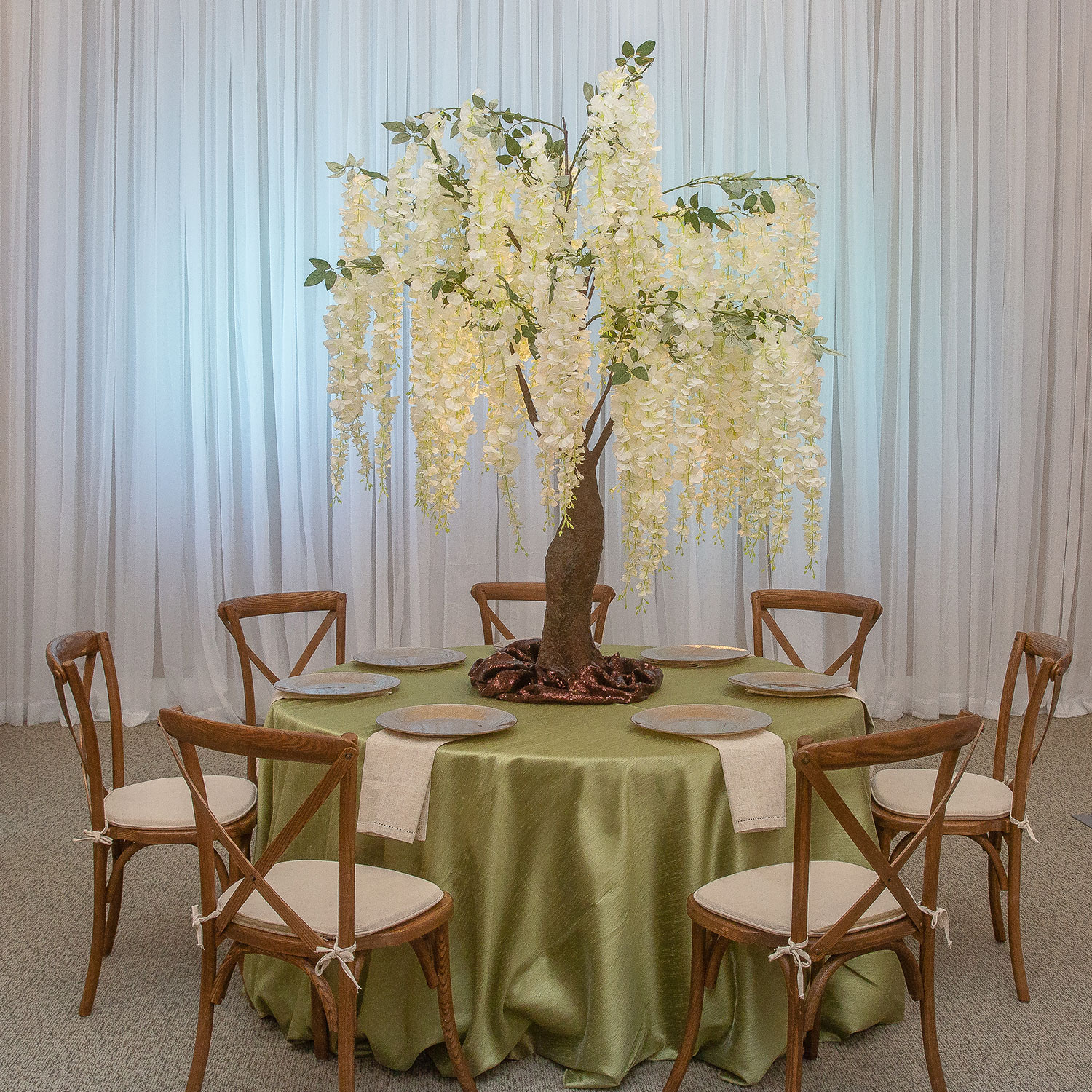 Create a truly magical experience with these 6’ 5” wisteria trees. Filled with tiny white blossoms, and topped with green leaves peaking from between the flowers, these trees will transform your event space into a blossoming springtime fairytale. The delicate looking flowers and textured bark make this decoration fool the eye. Because the trees store well, you can use them again and again making them a must have for a decorators inventory. These trees create a big impact for a small price, making them ideal for intimate designs, corporate events, weddings, and outdoor parties.