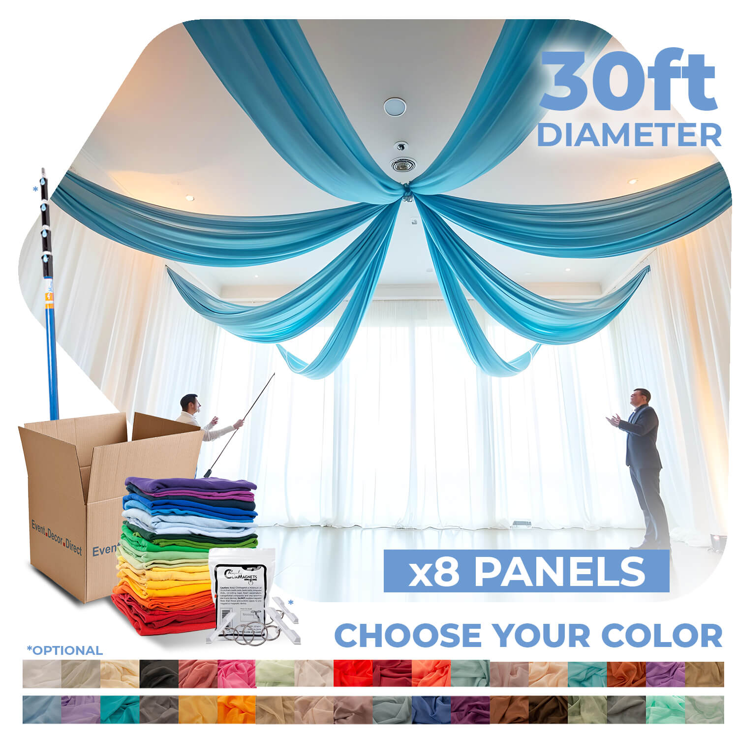 Our prefabricated kits allow you to set up full ceiling draping in just a few minutes, all from the ground - no ladder needed! With pre-sewn grommets and use of our magnet kit, ceiling draping has never been so elegant and easy to set up! Our kits come with many common hanging tools and a variety of options to fit your ceiling scenario.