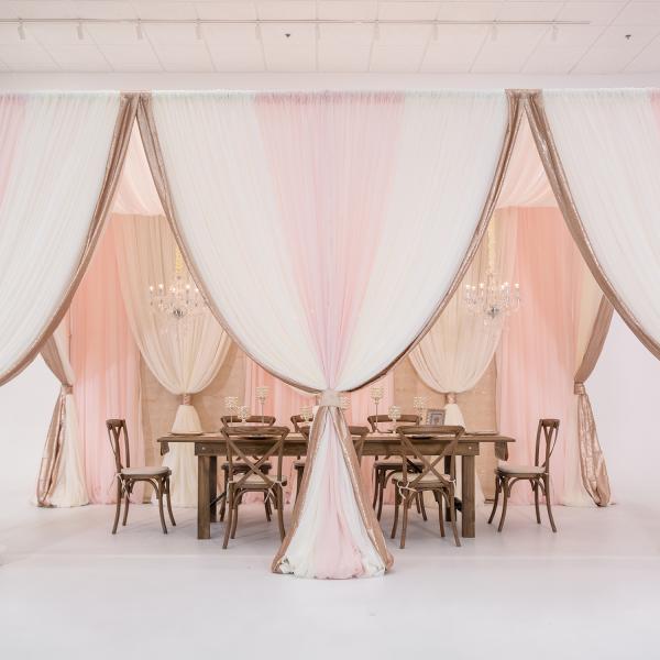 Drape this exquisite canopy sporting blush, ivory, rose gold marble and featuring nude matte sequins at your next event and let the lush, luxurious folds envelop your guests. With three glistening crystal chandeliers, this design is romantic and glamorous, but not wihtout a vintage and rustic edge. (Table and Chairs pictured are not included).