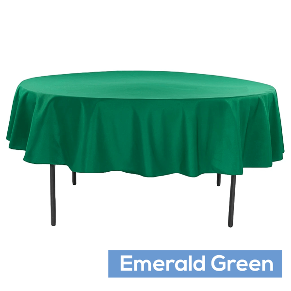 Color: Emerald Green Material: 100% Polyester Fabric Weight: Approx. 200 GSM Size: Approx. 90" round diameter. Seamless. Pack: 1 per polybag Care Instruction: Machine Washable & Dryable. Do not bleach. Drop: The tablecloth will hang half way between the tabletop and floor when placed over a 60" table with a 30" standard height.