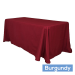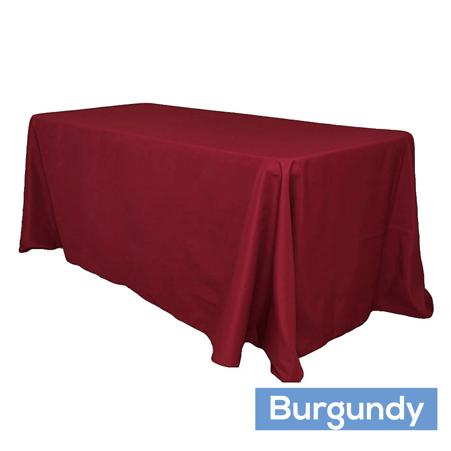 Color: Burgundy Material: 100% Polyester Fabric Weight: Approx. 200 GSM Size: Approx. 90"x132" rectangular (rounded corners) Pack: 1 per polybag Care Instruction: Machine Washable & Dryable. Do not bleach. Drop: A 90"x132" Tablecloth will touch the floor placed over a 6 foot rectangular table. (30" standard height)