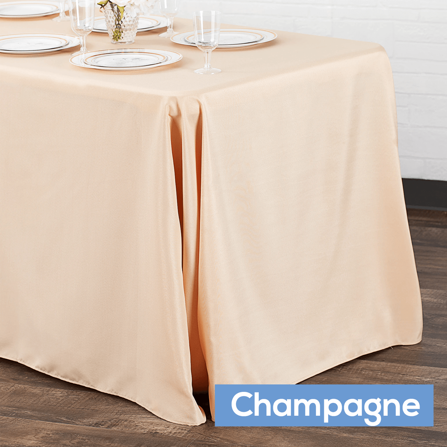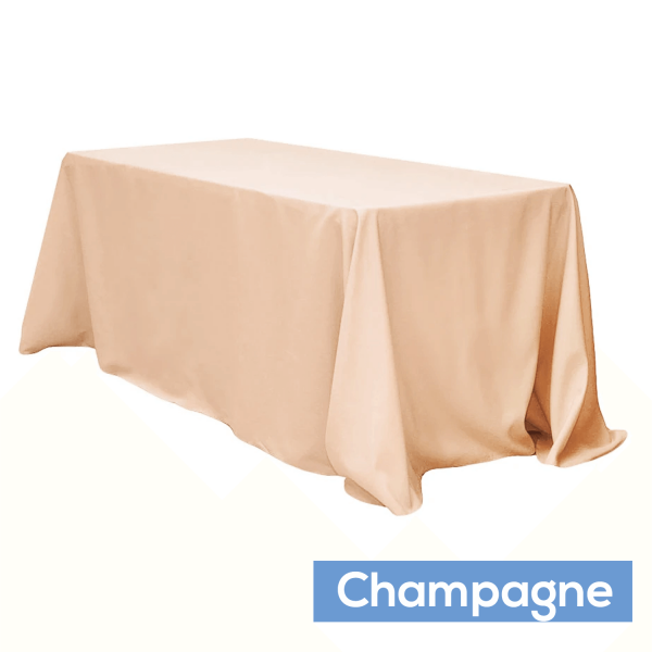 Color: Champagne Material: 100% Polyester Fabric Weight: Approx. 200 GSM Size: Approx. 90"x132" rectangular (rounded corners) Pack: 1 per polybag Care Instruction: Machine Washable & Dryable. Do not bleach. Drop: A 90"x132" Tablecloth will touch the floor placed over a 6 foot rectangular table. (30" standard height)