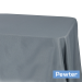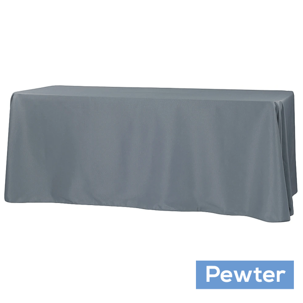 Color: Pewter Material: 100% Polyester Fabric Weight: Approx. 200 GSM Size: Approx. 90"x132" rectangular (rounded corners) Pack: 1 per polybag Care Instruction: Machine Washable & Dryable. Do not bleach. Drop: A 90"x132" Tablecloth will touch the floor placed over a 6 foot rectangular table. (30" standard height)