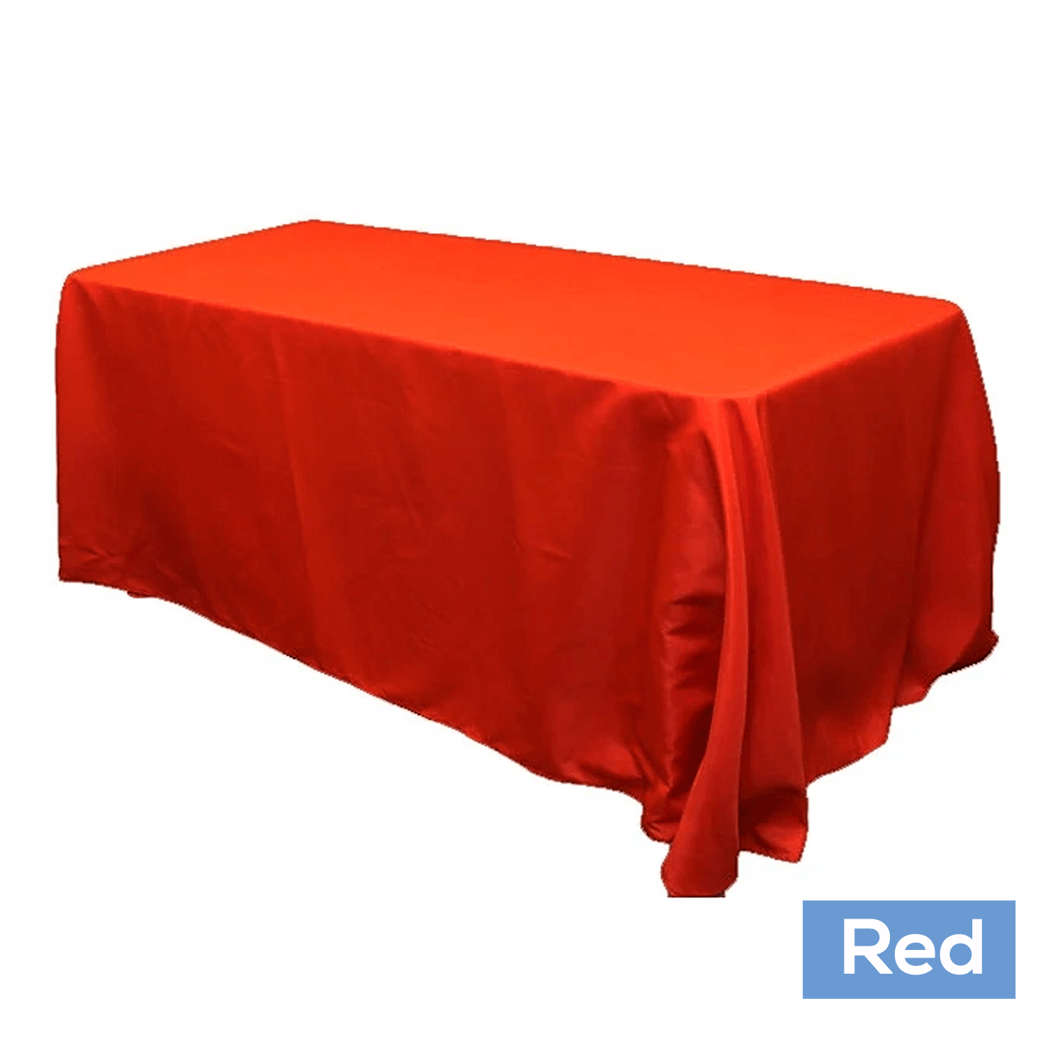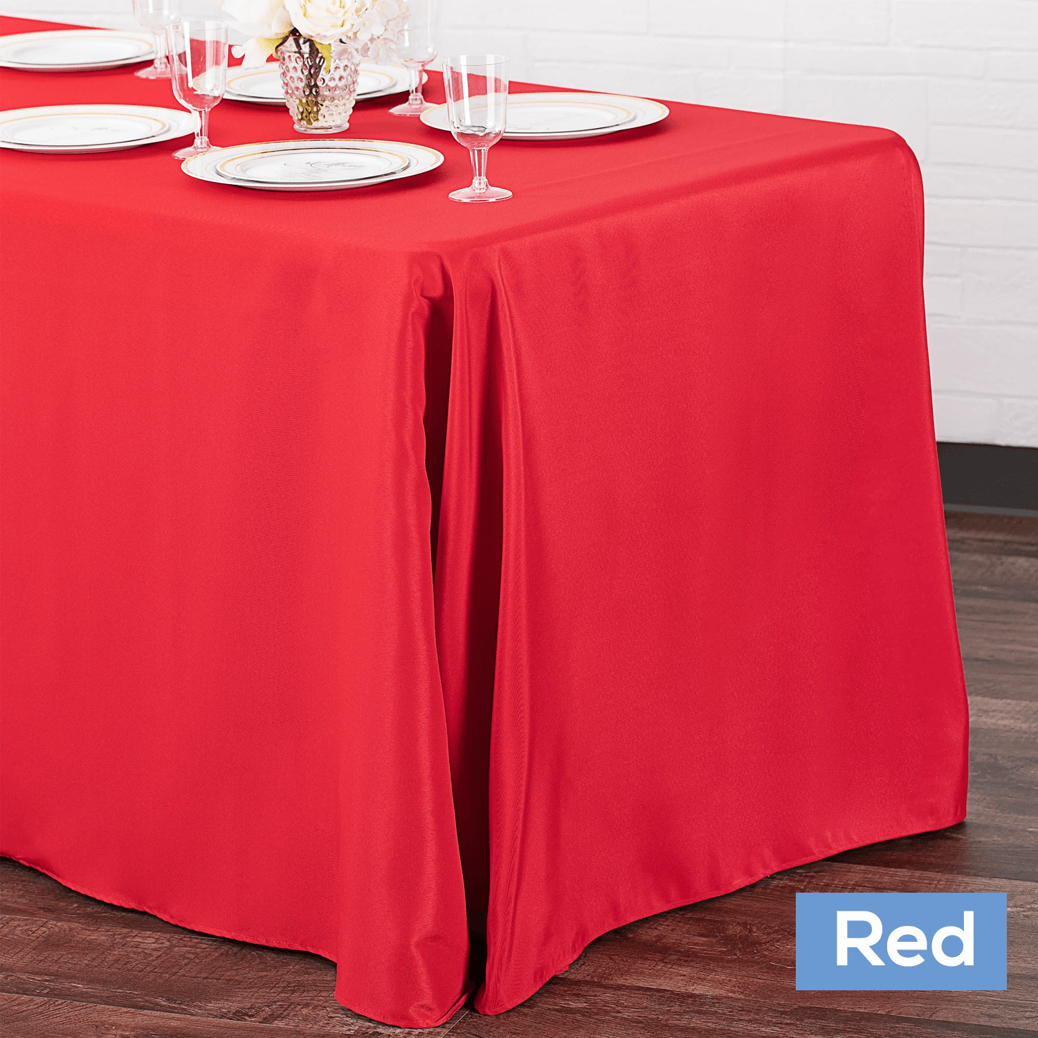 Color: Red Material: 100% Polyester Fabric Weight: Approx. 200 GSM Size: Approx. 90"x132" rectangular (rounded corners) Pack: 1 per polybag Care Instruction: Machine Washable & Dryable. Do not bleach. Drop: A 90"x132" Tablecloth will touch the floor placed over a 6 foot rectangular table. (30" standard height)