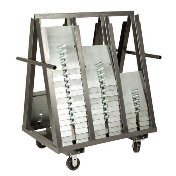 This A-frame slip-fit base care is an amazing invention that works with the design of our bases and saves you time and energy. When we designed our bases, we created a nook for the pins from other bases to slip into. This creates an easy stacking as shown with our A-frame cart. It can hold 100 16 by 14 bases or 150 8 x 14 bases.