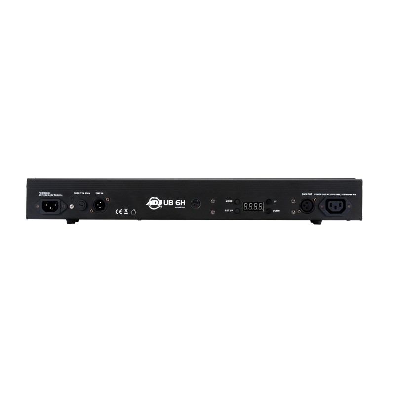 • 22.5-inch (.5 meter) indoor Linear Bar with 6x 6W Ultra bright RGBWA+UV HEX (6-IN-1) LEDs • Variable RGBWA+UV color mixing offers a seemingly unlimited color palette - Great for Stage or Wall Washing! • 4 DMX Channel Modes: 6, 10, 12 or 18 channels • 6 operational modes: Auto Run, Program Mode, Sound Active, RGBWA+UV Dimmer, Static Color and DMX-512 Mode • 3-Section Pixel control • Patent Pending Quick Align (Magnetic) • Beam Angle: 40 degrees • Flicker Free operation @2200Hz • 4-Button DMX LED Display • 63 built-in Color Macros • LED pulse & strobe effect • Electronic Dimming: 0-100% • Includes mounting brackets to mount on a wall or set on the ground • Compatible with the ADJ UC IR (included) and Airstream IR App • Long Life LEDs (Rated at approximately 50,000 hrs.) • Power Draw: 30W @ 120V • Linkable: DMX via 3-pin XLR cable; Power via IEC daisy-chain power link (Up to 29 UB 6H fixtures @ 240V) • Multi-voltage operation: AC 100V-240V 50/60Hz • Dimensions (LxWxH): 22.5” x 2.5” x 3.75” • Weight: 3.5 lbs./ 1.58 kg. • ETL Approved