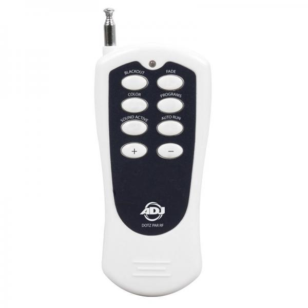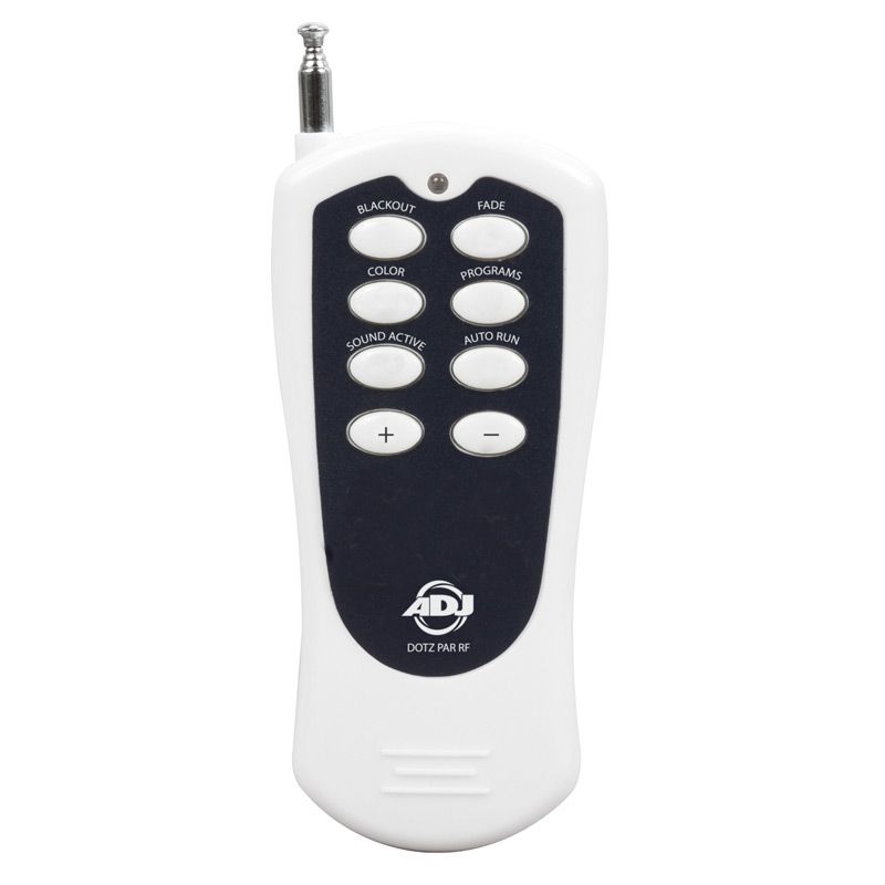 Our ADJ products are some of the best that the market has to offer. A specialist pro audio, video, and lighting supplier, ADJ's range of cutting edge tools and merchandise is vast, but assembly is always easy and performance is always exceedingly reliable. Whether producing an extravagant corporate event or setting up something more low key, ADJ has it all. The Dotz Par RF wireless remote, for instance, has many different functions and allows you to control a variety of ADJ LED Pars from long distance. The remote can control your system up to 75 feet / 25 meters. To use the remote you must first activate the fixtures receiver, to activate the receiver please see the instructions for the specific fixture.BLACKOUT - Pressing this button will blackout the fixture.FADE - This button will activate the color fade program.COLOR - This button will activate the static color mode. Use the “+” and “-” buttons to scroll through the colors and find your desired color.PROGRAMS - This button will activate the built-in programs mode. Use the “+” and “-” buttons to scroll through the 13 programs and find your desired program.SOUND ACTIVE - This button activates sound active mode.AUTO RUN - This button will run an automatic program. Use the “+” and “-” buttons to adjust the speed of the auto run.“+” and “-” - Use these buttons to adjust the speed of the Auto Run, scroll