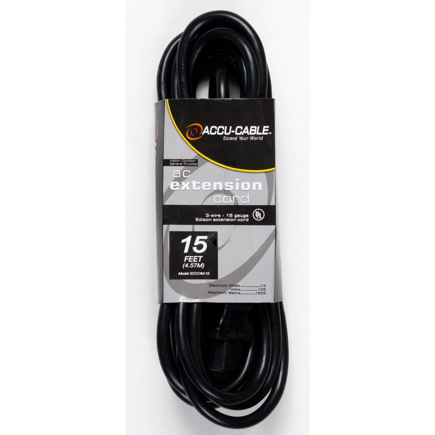 The ECCOM-15 is a 15-foot IEC male to IEC female black AC extension Cord from Accu-Cable used to daisy chain power from one fixture to another.