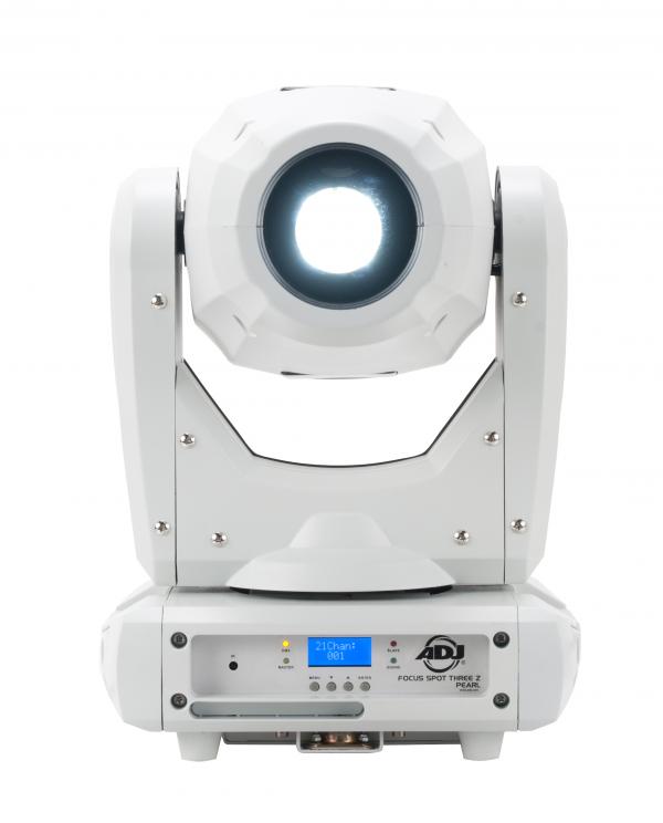 American DJ Focus Spot Three Z 100W LED Moving Head Spot with Motorized Focus The ADJ Focus Spot Three Z is a 100W LED Moving Head with motorized focus and motorized zoom allowing for a variable beam angle from 12 ~ 17—degrees. In addition, ADJ has fitted the Focus Spot Three Z with one rotating GOBO wheel, one fixed GOBO wheel and one color wheel, letting users generate unique patterns and effects in a series of vibrant hues. There are two 6-facet prisms (one circular and one linear), enabling spellbinding multi-beam effects capable of filling wide spaces with color and movement. It has 18 & 21 DMX channel modes, Pan/Tilt Inversion, 16-Bit Fine Pan/Tilt, 3-pin DMX I/nOut, PowerCon In/Out power connectors, and a 4-Button DMX LCD menu with 180-degree inverse view mode.
