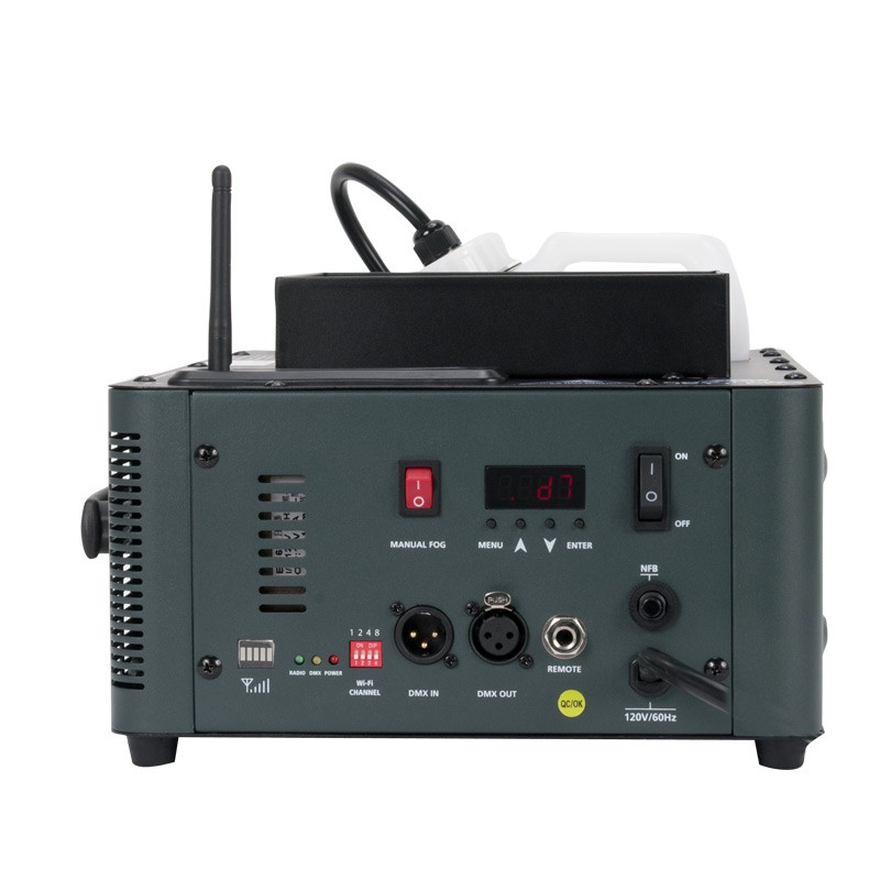 The Fog Fury Jett Pro may be use vertically or horizontally. The reservoir tank may be mounted in the front or rear of the unit so the machine may be pointed up or down. Control options included 3-pin and 5-pin DMX In/Out connections, ADJ’s WiFLY EXR wireless DMX on-board, plus the ADJ FFJWR wireless remote comes included in the box.