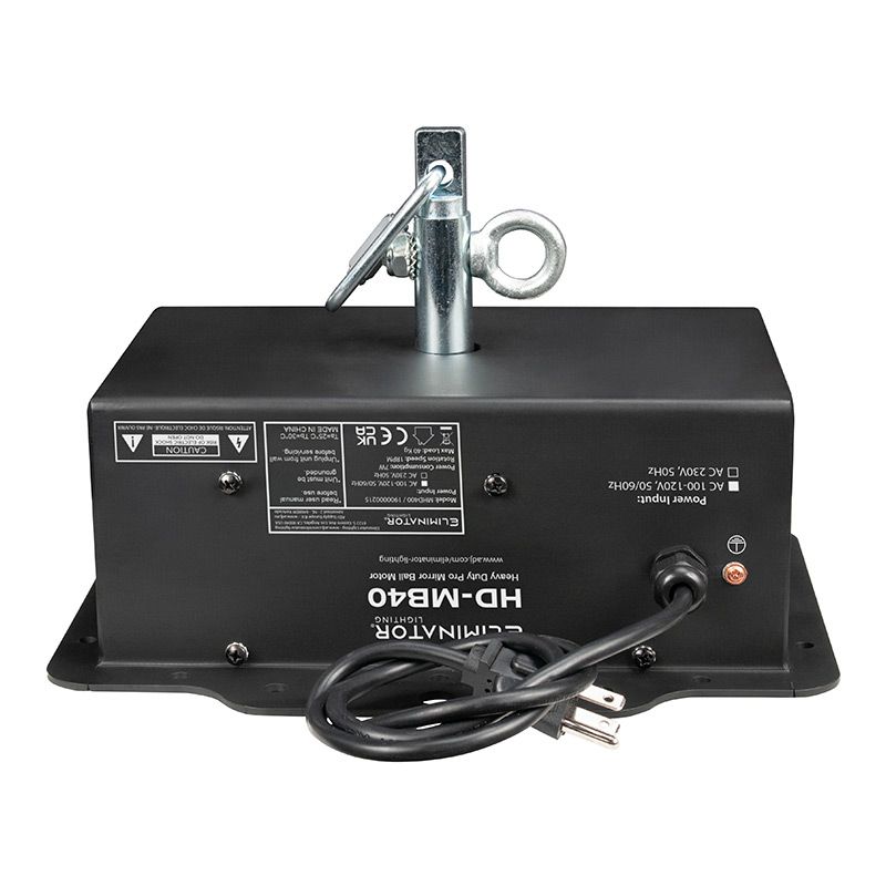 Specifications: • HEAVY DUTY PROFESSIONAL MIRROR BALL MOTOR • INDOOR USE ONLY • FOR USE WITH UP TO 40-INCH (1m) MIRROR BALL • MAX LOAD 89lbs. (40kg)