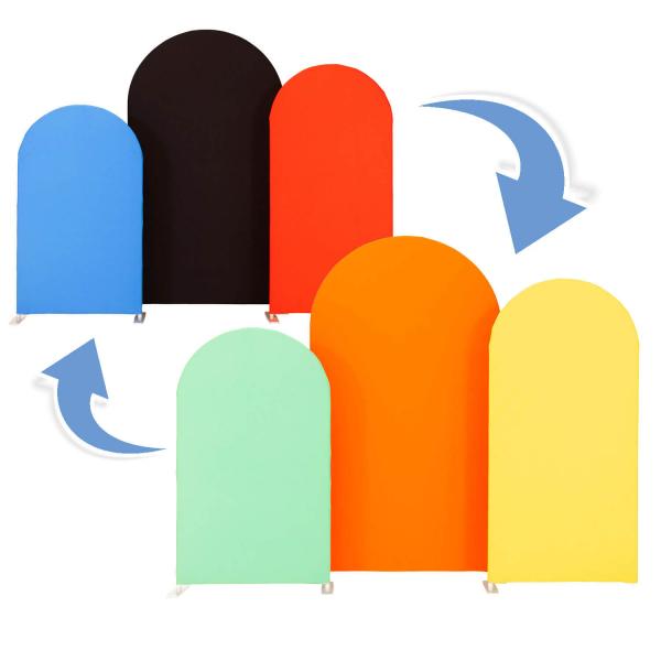 This handy arched backdrop set can be used in a variety of ways in a variety of settings. While other frames tend to be wobbly and fabric, too thin, we only use material of the highest quality from the frames to the material. We also have the most brilliant color themes with DUAL colored sides! In addition to it being visually pleasing and structurally top grade, it is also a dream to take apart and transport. So if you're a travelling designer, this one is for. you. The sturdy frame can be set up in 2 minutes and breaks down into a small carrying bag. Each set comes with 3 covers, each cover has dual (2) colors! Each set of 3 covers will give you the flexibility of using 6 colors, all within the same trendy color family! Get yours today and decorate away!