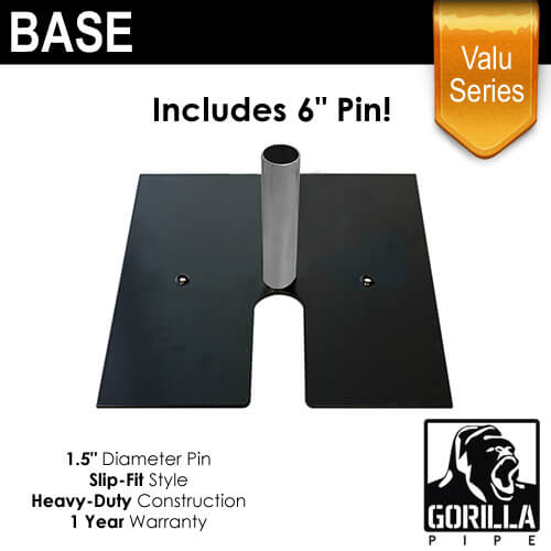 This 24” by 24” standard duty Valu series base is perfect for holding up our Valu Series uprights. The 24” x 24” standard duty base comes with a 6” pin which screws into the base and fits our 2” uprights and a slot to easily stack bases. This base is roughly 25lbs and works best for up to 18ft of height.