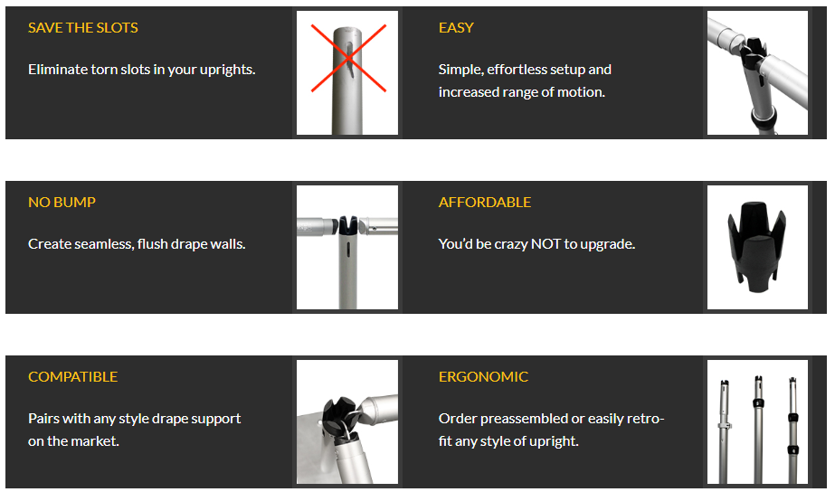 CrownTop is a one piece system which replaces traditional slots in Uprights and is compatible with all Drape Supports on the market, meaning you can use your existing Drape Supports, no matter the style, with CrownTop. CrownTop will eliminate torn slots and damaged drape from torn slots. It will also decrease your set up time and create even, no top bump drape walls. Maintenance free, it will extend the life of your product and change the way you use Pipe and Drape. CrownTop is a hard plastic piece installed at the top of any style Upright and replaces the slots as the new connector for your Drape Support.