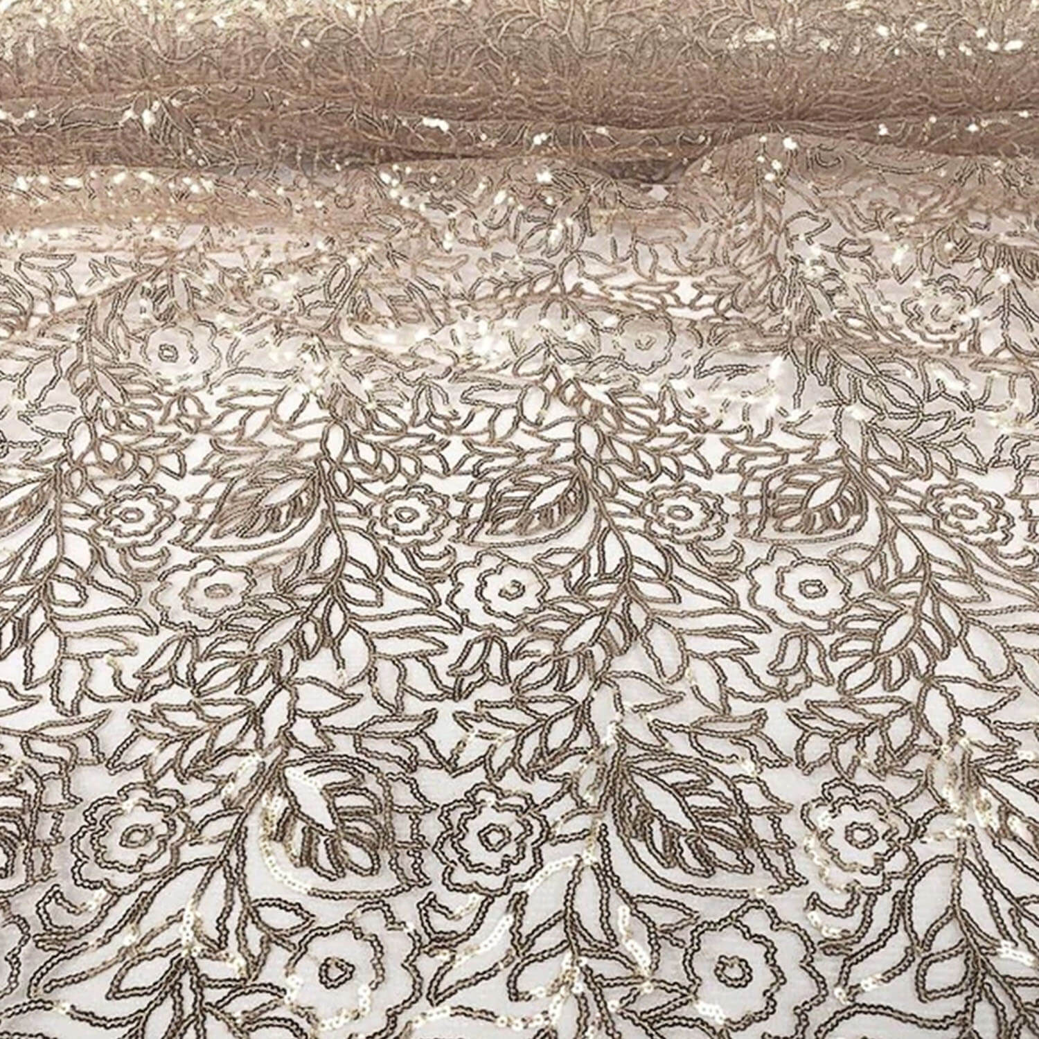 Upgrade the look of any flooring by using our champagne fancy leaf sequin overlay. This champagne fancy leaf sequin overlay is filled with embroidered flowers and leaves on a polyester sheer fabric and decorated with delicately placed sequins. Our many size options for this champagne fancy leaf sequin overlay allow you to choose the right one for you.