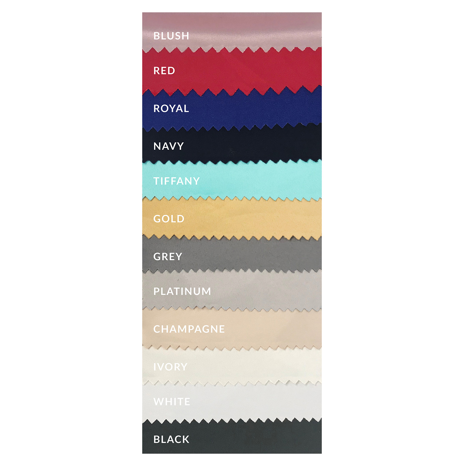 COLORS: Black, Blush, Champagne, Gold, Grey, Ivory, Navy Blue, Platinum, Red, Royal Blue, Tiffany Blue, White