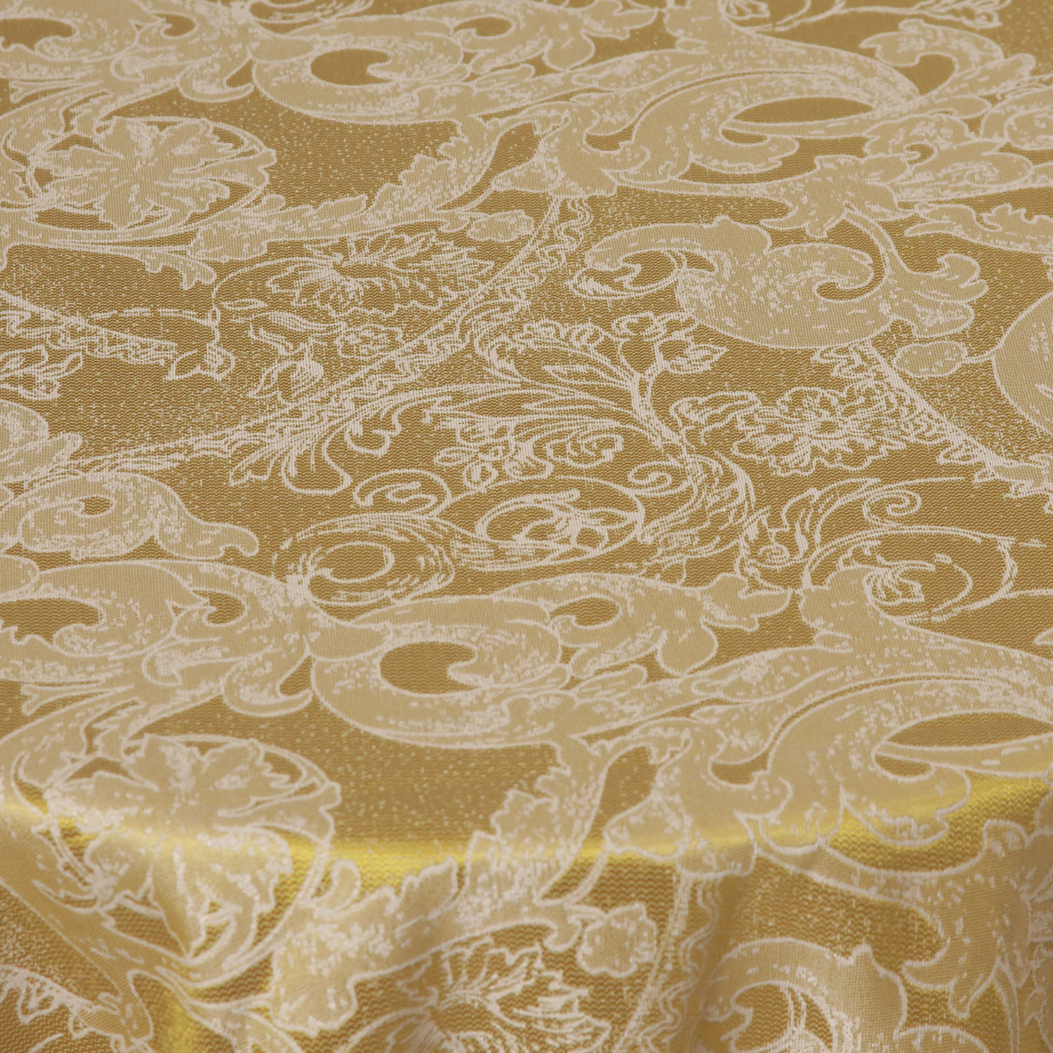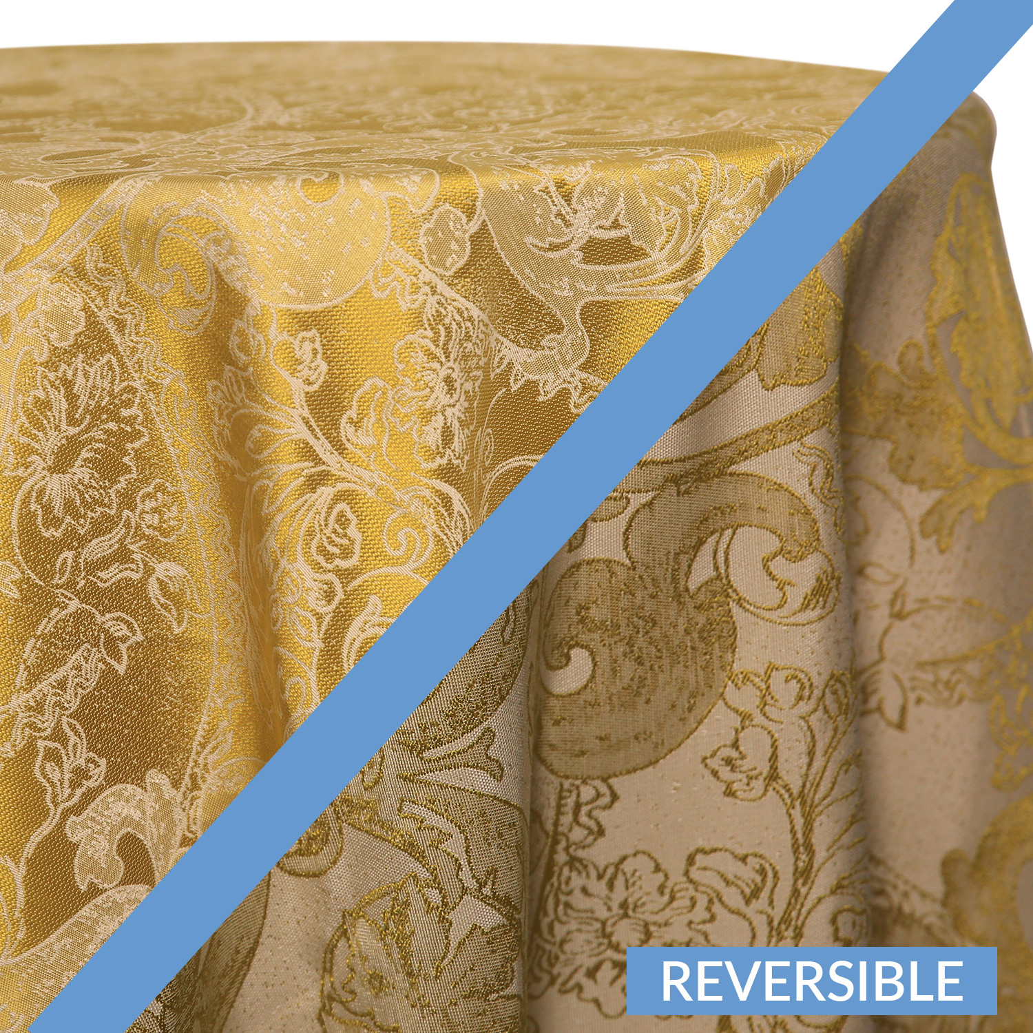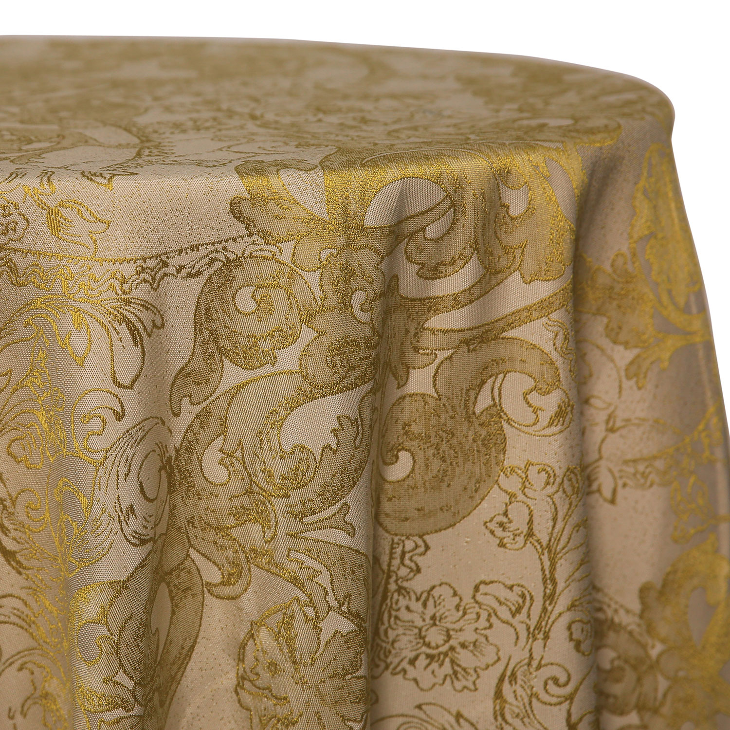 Add a touch of elegance and class to your event décor with this floral pattern in amber shades. These reversible table cloths have a chartreuse background with patterns in whites and lighter chartreuse. But flip them over for a different look, chartreuse patterns on a field of beige.