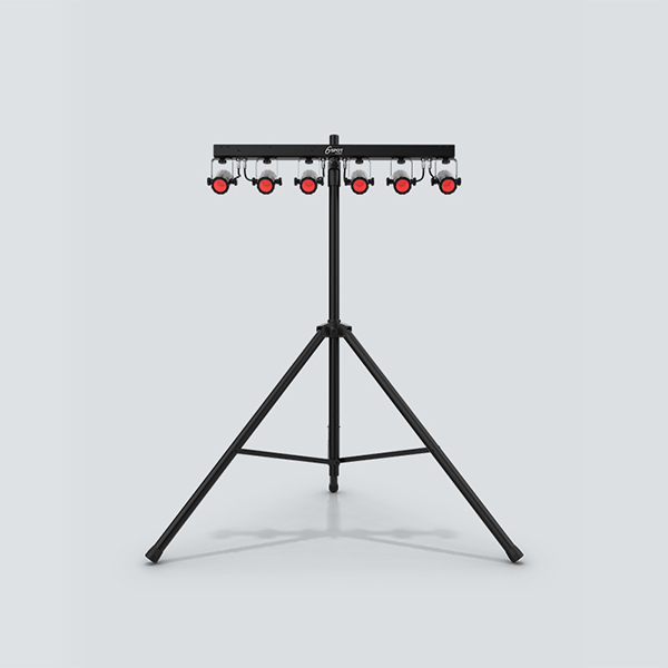 Turn any space into a dance floor with this lighting unity. An LED powered, color-changer system, this unit has 6 independent heads that can be adjusted and controlled as needed. Each head contains a tri-colored LED that creates 7 popular colors. Control with DMX or by using one of the onboard automated or sound-activated modes.  Fits on most tripods, this unit also works well when mounted to a truss. Comes with its own travel bag.