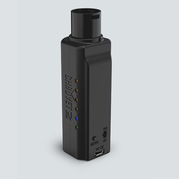 The D-Fi XLR TX plugs into a light’s XLR port and then transmits DMX and master/slave signals wirelessly to other similar units.