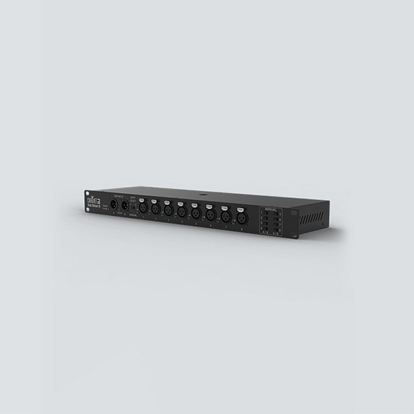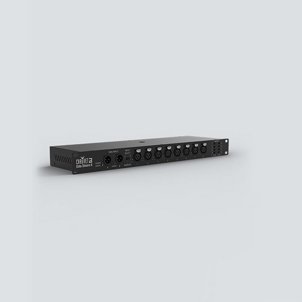The more complicated your light show, the more powerful your equipment must be. Our Data Stream 8 is a universal DMX splitter that allows you to distribute and boost the incoming signal from duel inputs into 8 different output through its master 3-osition switch. The unit is equipped with a threaded insert for securing it safely to trussing.