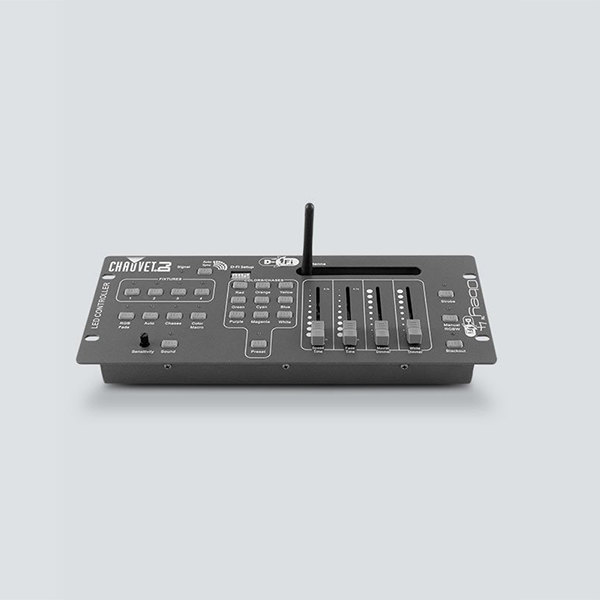 This small, full-featured light controller fits all our lighting needs. The built-in D-Fi transmitter allows users to build a light system without long cables – perfect for event lighting. The unit works with any D-Fi compatible product, controls 12 different types of lights, stores scenes and chases, and can be set to sound-activation, manually adjusted, or set for certain speeds and fade times, and it is set with fog and strobe controls.