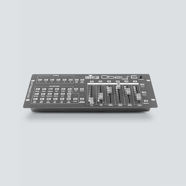 Not all lighting effects need to be complicated. With our Obey 6 controller, users get easy color mixing capability. This unit has 6 channels per fixture. Onboard capabilities include automated, sound-activated or manual playback options, built-in playback modes, variable fade times, strobe and blackout effects, and the ability to simultaneously operate each fixture in different playback modes. Make lighting your next event of show simple with this unit.