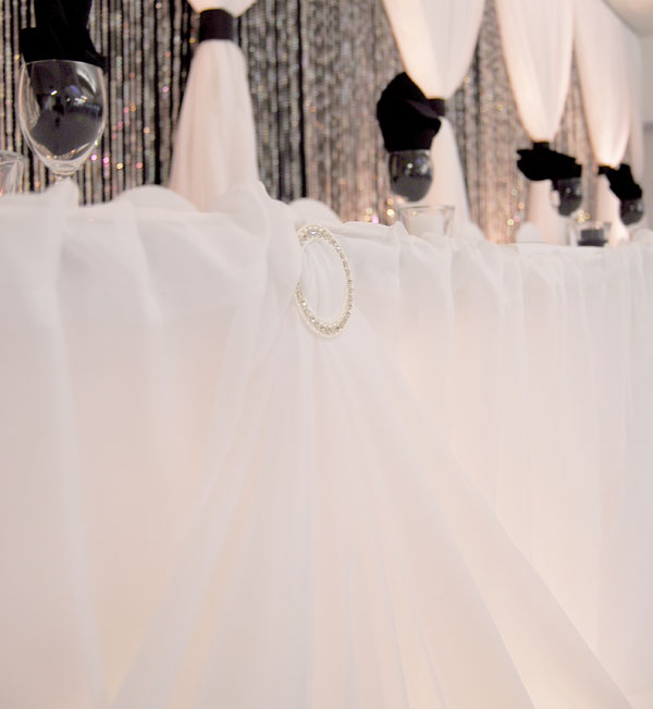 This 24ft Cinderella “stringed” table skirting kit decorates your event with class and style. This kit contains a skirt for a 24ft table or three 8ft tables, 10ft of premium sheer of your color choice, 60 brooches for decoration, and all the attachment equipment. Create the perfect wedding, entry, head, cake, or gift table in existence with this 24ft Cinderella table skirting kit.