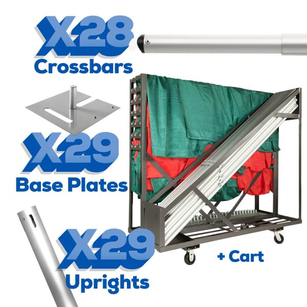 This listing includes the following: (1) PIPE & DRAPE "PARTY CART" (29) VALU SERIES - 15IN X 15IN STANDARD DUTY 6" X 1.5" BASE (29) VALU SERIES - 8FT 1.5" FIXED UPRIGHTS (28) 6-10FT TELESCOPING DRAPE SUPPORT W/ BUTTON STOPS DRAPE IS NOT INCLUDED - SHOP DRAPE OPTIONS FOR THIS KIT HERE