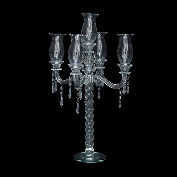 This darling candelabra adds elegance, beauty, and a touch of enchantment to your event décor. Made of acrylic crystal, the airy translucent base seems delicate in its pattern of stacked spheres. Topped with four curving arms gracefully supporting a candle cup, topped with a  hurricane globe, all surrounding a matching 5th candle arm, this piece will bring beautiful mood lighting to the center of every table. Each arm is hung with crystal beadwork, ending in a small pendent.