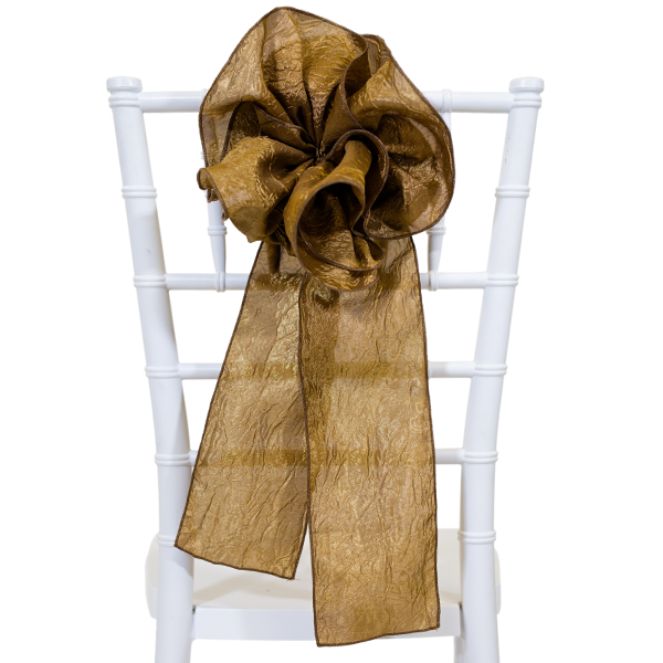 Our 9” bronze crushed taffeta flower chair accents will take your chairs from boring to beautiful. The design of the bronze flower can be customized to your needs, including adding fabric buttons, glittering brooches, or sparkling buckles. The bunched bronze flower drapes gorgeously on the back and fits almost any chair style.